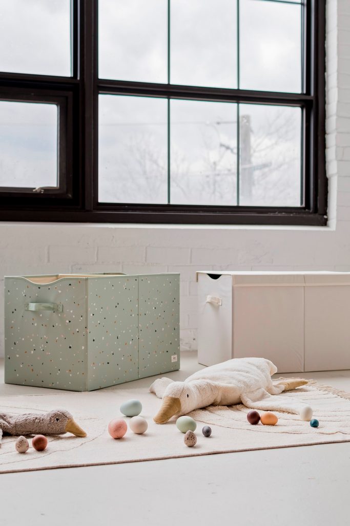 Tato truhla na hračky je praktickým a stylovým řešením pro ukládání dětských věcí. Díky zesíleným lepenkovým stěnám volně stojí v místnosti a zároveň se stává krásnou dekorací.