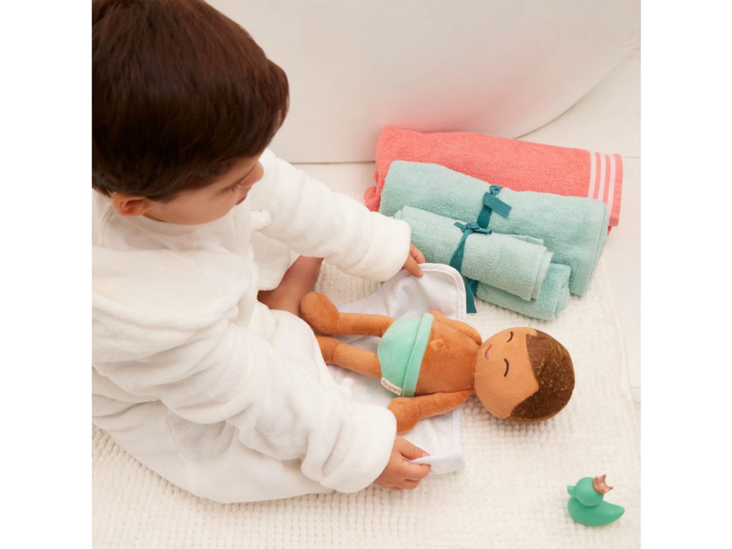 Jedinečná panenka Lulla Baby z měkkého plyšového materiálu je speciálně navržená pro hraní ve vodě. Vaše dítě může panenku koupat během pravidelného večerního koupání, ale můžete ji využít i pro hraní s vodou ve vaničce na zahradě. Hraní s panenkou pomáhá rozvíjet emoční dovednosti, empatii i představivost dítěte. Panenka je oblečena do tílka a kalhot a je vybavena ručníkem a kačenkou do vody. Pro skončení koupání z panenky jemně vymačkejte vodu a nechte ji uschnout na vzduchu nebo v sušičce na nízkou teplotu. Rozměry: 35 x 16 x 5,1 cm Vhodné pro děti od 2 let.