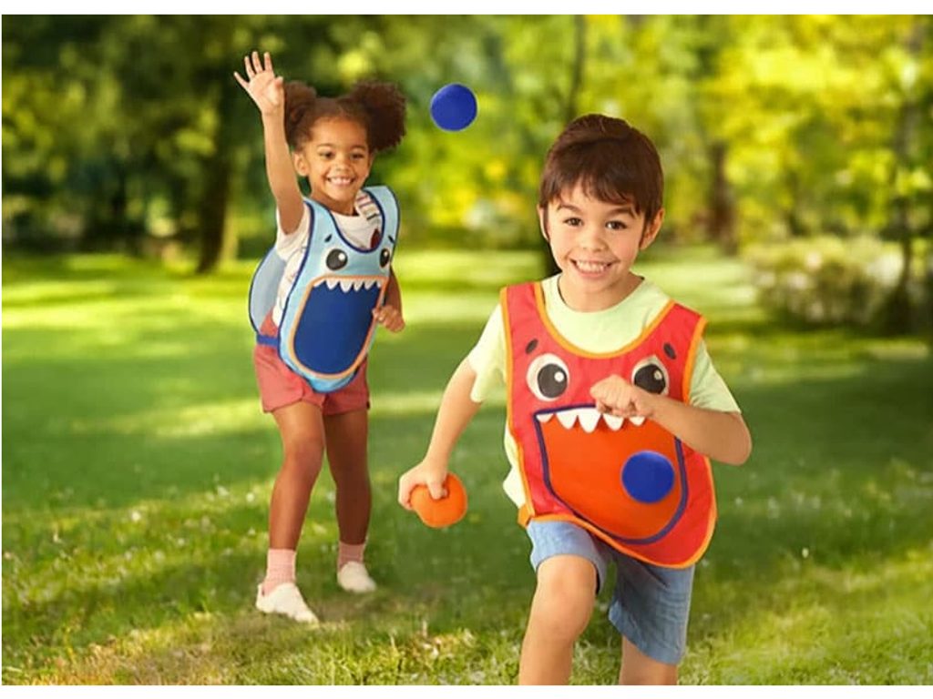 Sada obsahuje dvě snadno navlékací vesty s terčem vpředu i vzadu a šest měkkých míčků se suchým zipem. Hra je bezpečná, veselá a pokaždé jiná. Podporuje pohyb, spolupráci i představivost.
