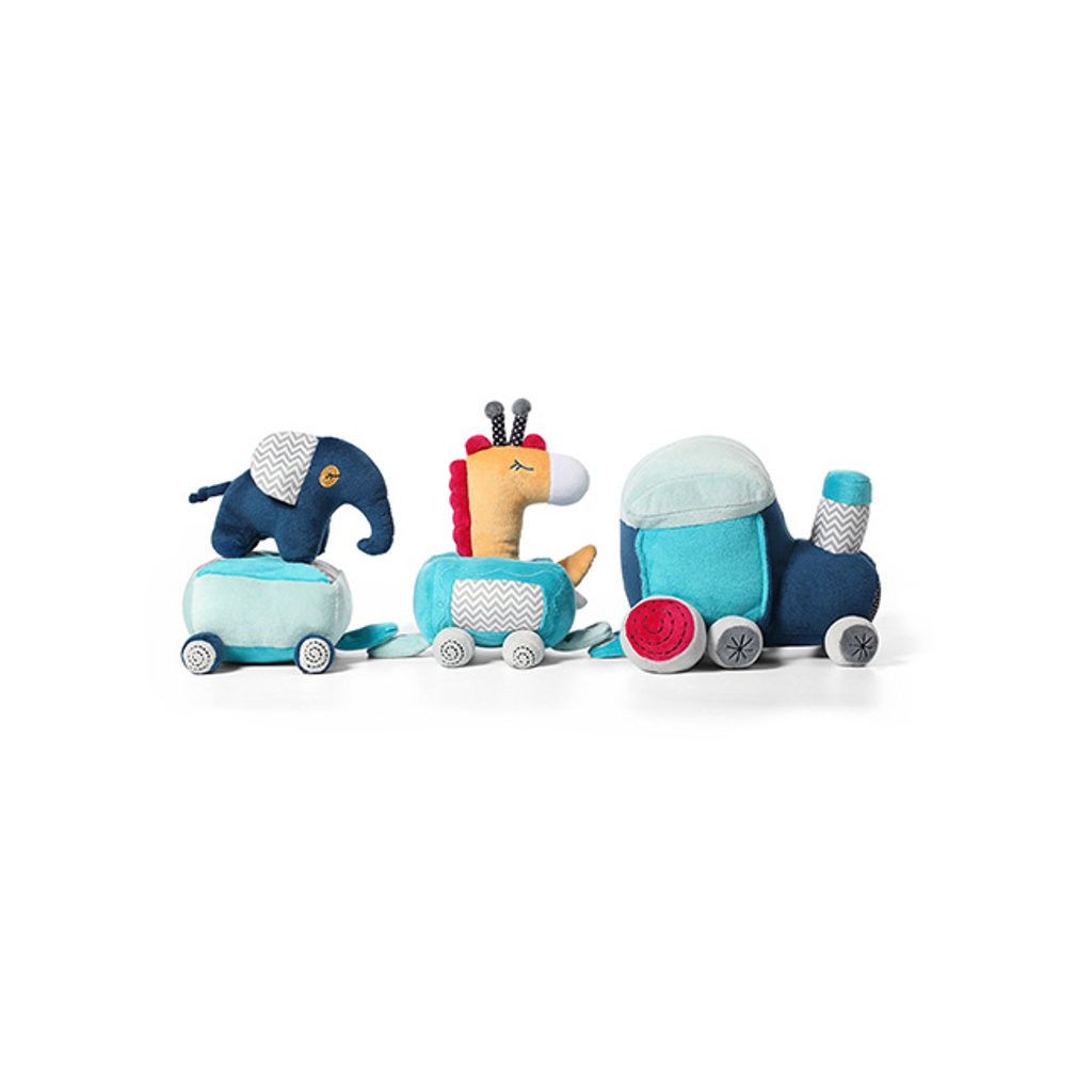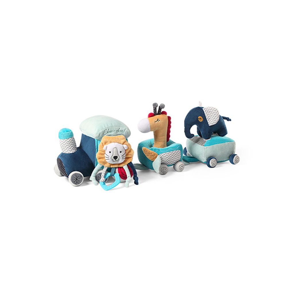 Vláčková sada vzdělávacích hraček Safari train se skládá z lokomotivy se dvěma vagóny a připojenými plyšovými hračkami: pískajícími, chrastícími a šustícími. Hračka seznamuje dítě s rozmanitým světem barev, zvuků a tvarů. Díky přichycení na suchý zip a důmyslně navrženým prostorům pro hračky lze vytvářet zajímavé kombinace, které podněcují kreativní myšlení. Vlastnosti: - skládá se z několika dílů, které lze připevnit pomocí suchého zipu - to stimuluje mozek dítěte a rozvíjí kognitivní schopnosti, jakož i učí prostorové myšlení - jemný zvuk vyzvánění má uklidňující účinek na děťátko - pískací prvky ukryté v hračce naučí dítě vztahům příčiny a následku - barevné uzlíky stimulují dětský hmat a šustící prvky dětský sluch - vyrobeno z kvalitních materiálů s důrazem na každý detail Bezpečnost: hračky splňují bezpečnostní normy platné v Evropské unii. Parametry: - Prvky soupravy: vláček se dvěma vagóny, šustící kousátko ve tvaru lva, pískací hračka ve tvaru žirafy, chrastítko ve tvaru slona - Materiál: 100% polyester - Hmotnost: 0,70 kg - Vhodné pro děti od narození - Rozměry: 41 x 18 x 12 cm Adresa dodavatele: Babyono sp. z o.o., Kowalewicka 13, 60-002 Poznań, Poland. +48 61 83 90 520, info@babyono.pl, www.babyono.com Odstraňte všechny ochranné prvky hračky, které by mohly být nebezpečné pro dítě. Před každým předáním hračky dítěti zkontrolujte její stav. Pouze nepoškozená hračka zaručuje bezpečné používání vašemu dítěti. Vyhoďte hračku, jakmile zjistíte první známky poškození. Hraní se doporučuje pod dohledem dospělé osoby. Hračka odpovídá normě EN 71. Doporučujeme uchovat obal pro informaci. Obal uchovávejte na místě nepřístupném dětem. Obal a upevňovací prvky nejsou hračkou a mohou představovat nebezpečí pro zdraví dítěte. Adresa výrobce: Babyono sp. z o.o., Kowalewicka 13, 60-002 Poznań, Poland. +48 61 83 90 520, info@babyono.pl, www.babyono.com