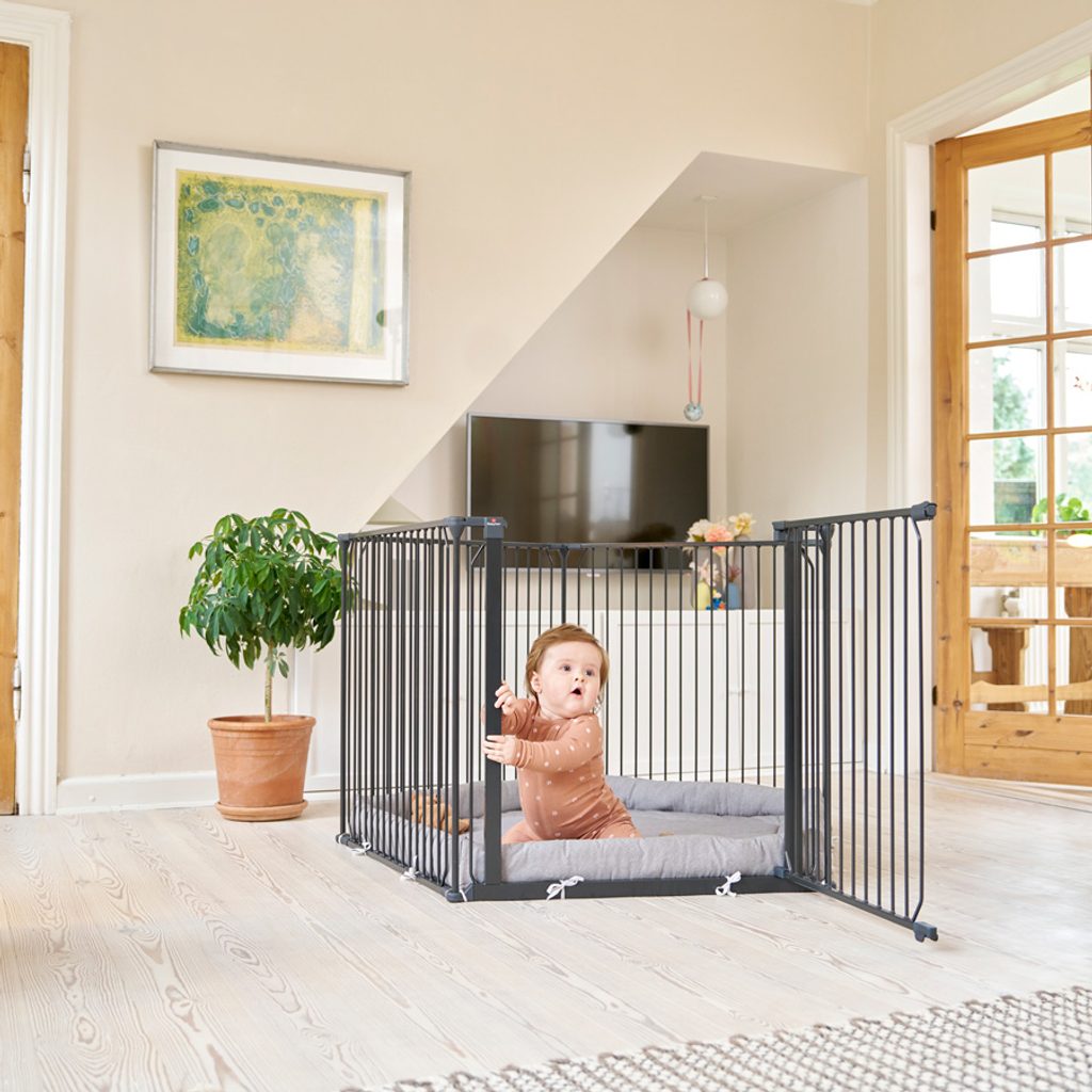 Jak vaše dítě roste, ohrádku lze jednoduše přeměnit na bezpečnostní zábranu, zábranu ke krbu nebo přepážku pro větší prostor. Stačí přidat nástěnné držáky (prodávají se samostatně) a můžete rozšířit zábranu až na 350 cm. Pro pohodlný průchod máte k dispozici široká dvířka, která lze otevřít jednou rukou z obou stran – ideální pro každodenní použití. Díky flexibilnímu designu a odolné konstrukci je BabyDan Carl spolehlivým řešením pro vytvoření bezpečného prostoru i ve větších místnostech. Lze ji neomezeně prodlužovat pomocí prodloužení (33 cm nebo 72 cm prodloužení jsou k dispozici samostatně).