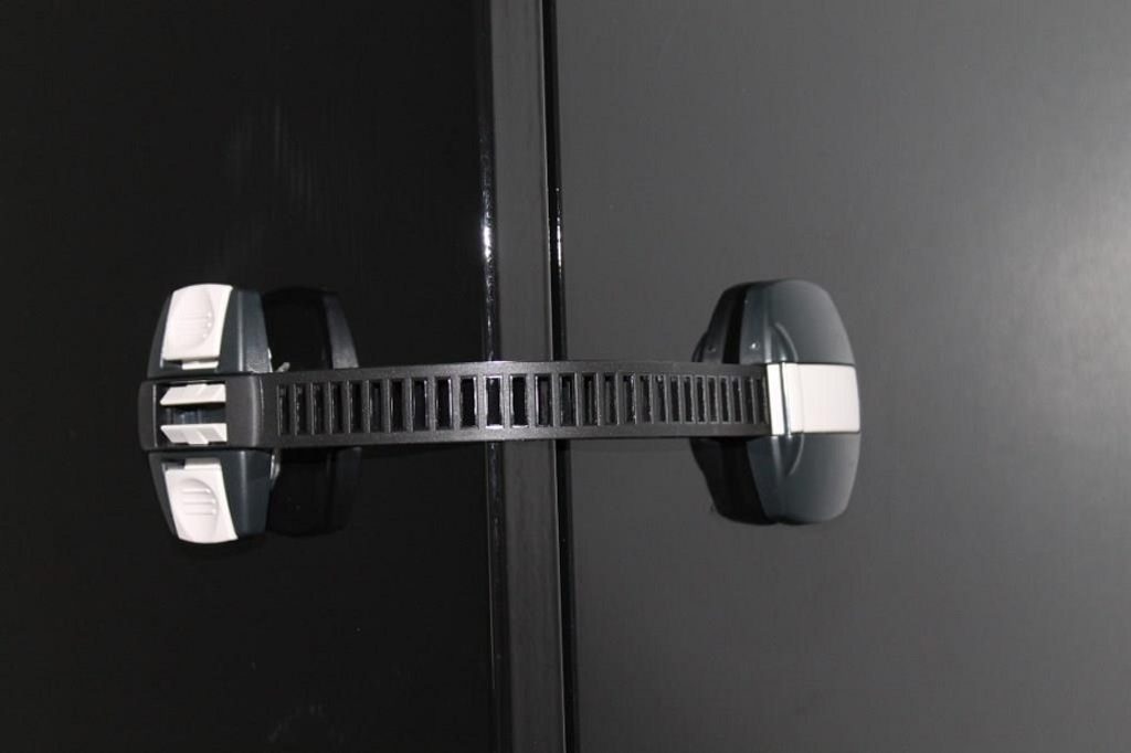 Univerzální bezpečnostní pás. Nejuniverzálnější bezpečnostní pojistka. Zajišťuje uzavření dvířek, šuplíků, ledničky, mrazničky,sušičky a dalších výrobků. Biodegradabilní balení. Upevňuje se na rovné povrchy lepením (samolepící) a na nerovné povrchy šroubováním.