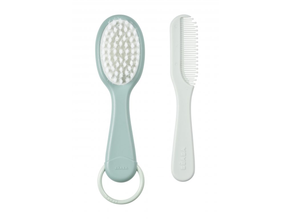 Sada pro péči o vlásky vašeho dítěte od narození obsahuje kartáč s měkkými štětinami a hřebínek se zaoblenými zuby. Ergonomický tvar kartáče i hřebene usnadňuje rodiči uchopení. Hřebínek je uložený v zadní části kartáče, celou sadu můžete díky kroužku snadno zavěsit na háček. Vhodné pro děti od narození.