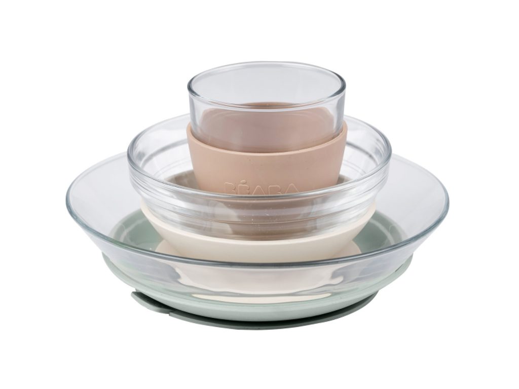 Unikátní sadu nádobí z tvrzeného skla tvoří jídelní miska, talířek a sklenička ergonomického, zaobleného tvaru s hladkými hranami. Miska a talíř jsou doplněny speciálními odnímatelnými podložkami z pružného materiálu s přísavkou, která zajišťuje stabilitu misky či talíře na stole a usnadňuje dítěti stolování. Návlek na skleničku ze stejného materiálu usnadňuje dítěti uchopení skleničky a snižuje riziko jejího vyklouznutí z ruky. Tvrzené sklo je 100% hygienický materiál odolný vůči poškrábání, nárazům a vysokým teplotám. V případě rozbití nedojde k vytvoření ostrých střepů. Sada nádobí je výsledkem spolupráce dvou francouzských značek - Beaba a Duralex. Ikonická značka Duralex je od roku 1945 průkopníkem ve výrobě tvrzeného skla. Nádobí je vyrobeno ve Francii. Nádobí bez odnímatelných podložek lze ohřívat v mikrovlnné troubě i mýt v myčce. Podložky je možné mýt ručně. Rozměry a hmotnost: Talíř: ø 17,5 cm x v 4,3 cm, 337 g Miska: ø 12 cm x v 5,3 cm, 300 ml, 243 g Sklenice: ø 7,1 cm x v 7 cm, 150 ml, 156 g Vhodné pro děti od 4 měsíců.