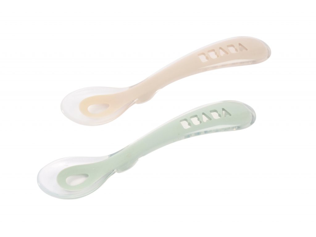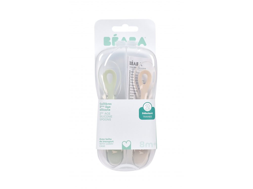 Silikonová lžička pro první samostatné krmení má ideální tvar pro dětská ústa. Tvar držadla usnadňuje dítěti držení lžičky. Integrovaná opěrka lžičky zabraňuje při položení lžičky na stůl kontaktu jídla se stolem a zajišťuje tak čistotu a hygienu. Praktické pouzdro umožňuje hygienické přenášení lžiček např. v přebalovací tašce. Lžičky jsou vyrobeny z vysoce kvalitního potravinářského silikonu. Možno mýt v myčce. Vhodné pro děti od 8 měsíců.