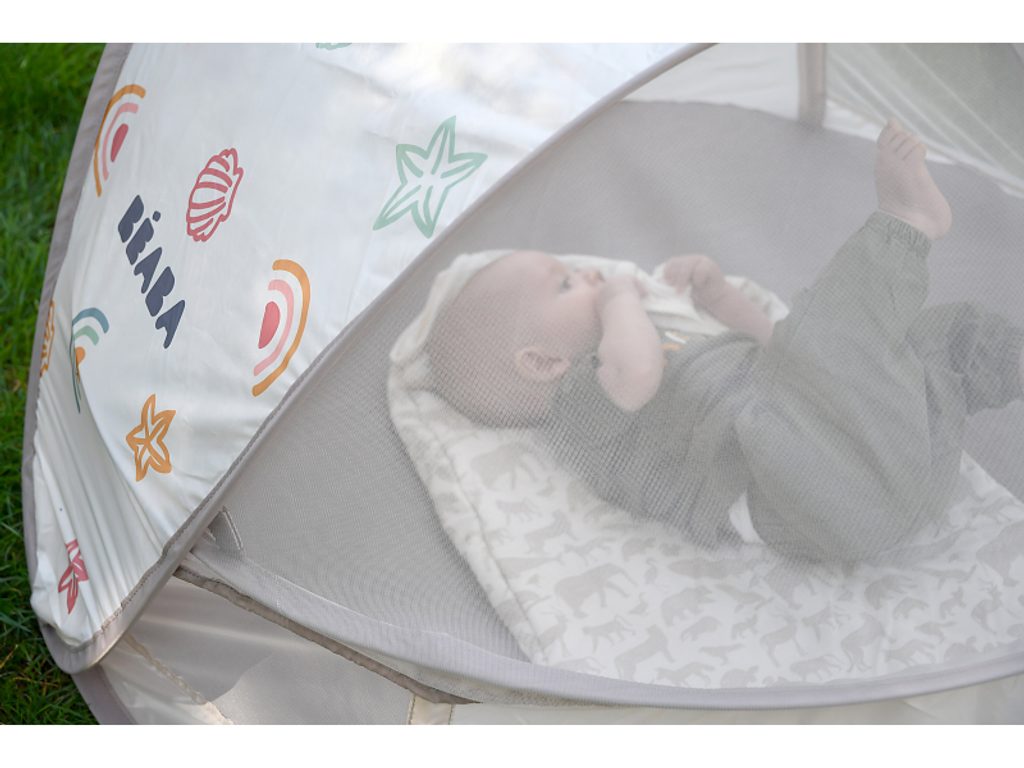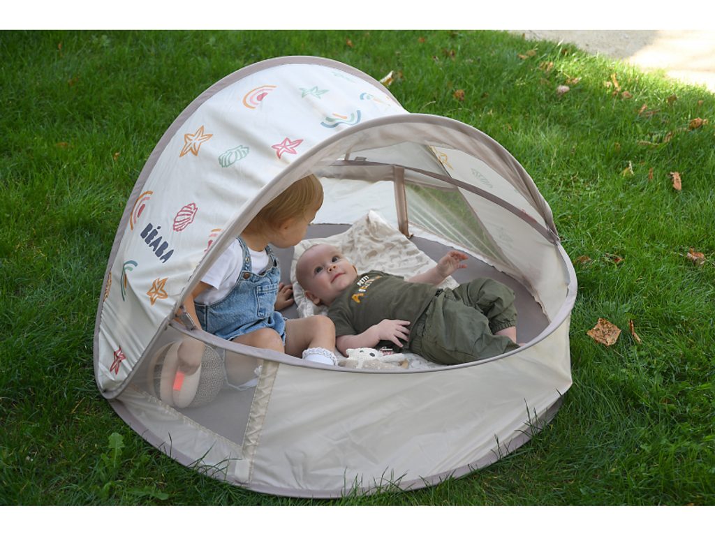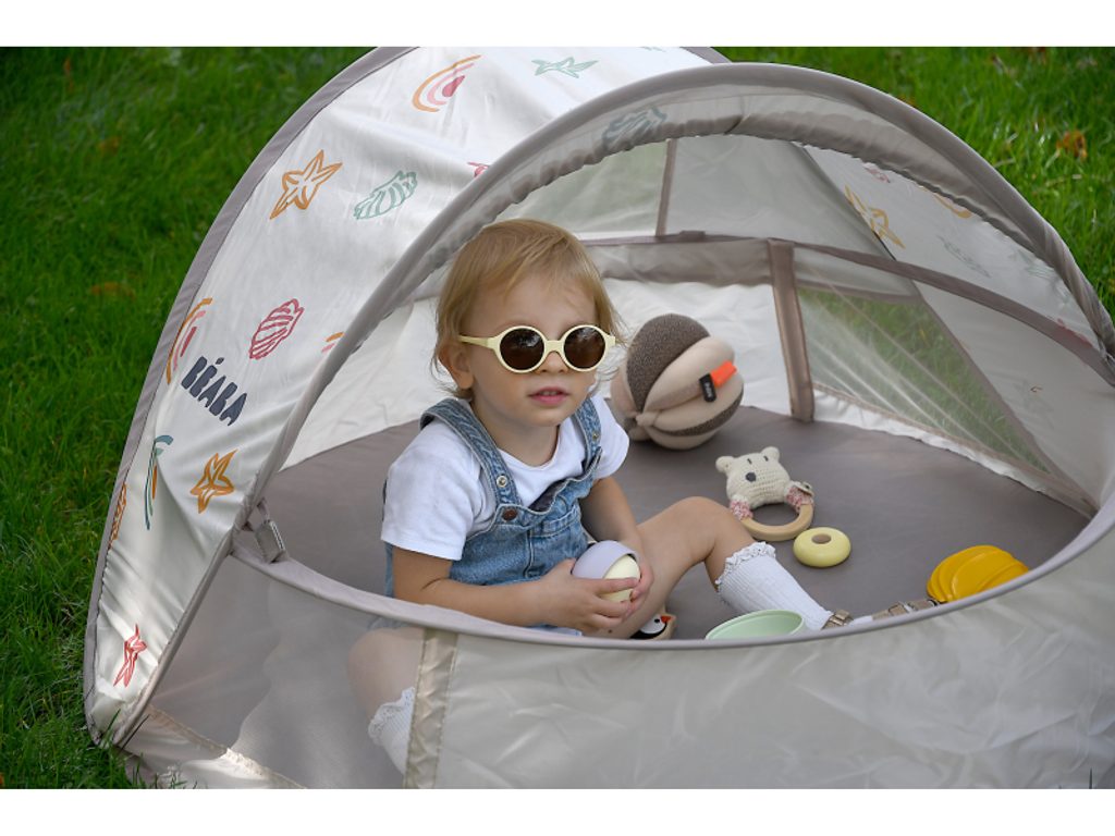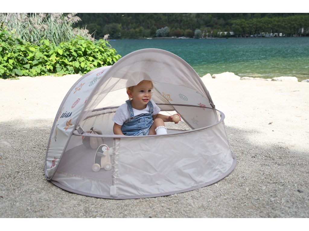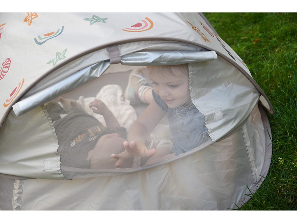 Přenosný univerzální stan s UV faktorem 50+ pro ochranu dítěte před sluncem na zahradě, na pláži či na výletech do přírody. Stan umožňuje snadnou ventilaci díky bočním otvorům se síťovinou a textilními chlopněmi, které je možné srolovat. Síťovina chrání dítě ve stanu před obtížným hmyzem. Tkanina s chladivým efektem pomáhá snižovat teplotu uvnitř stanu. Díky vysokým okrajům stan slouží i jako hrací ohrádka. Stan s vyskakovacím systémem velmi snadno složíte i rozložíte. Po složení do přenosné tašky jej vezmete s sebou kamkoli potřebujete. Příslušenství: taška na přenášení, 4 kolíky pro uchycení stanu. Složení: 100% polyester (bez PFAS) Vhodné pro děti od narození do 24 měsíců.