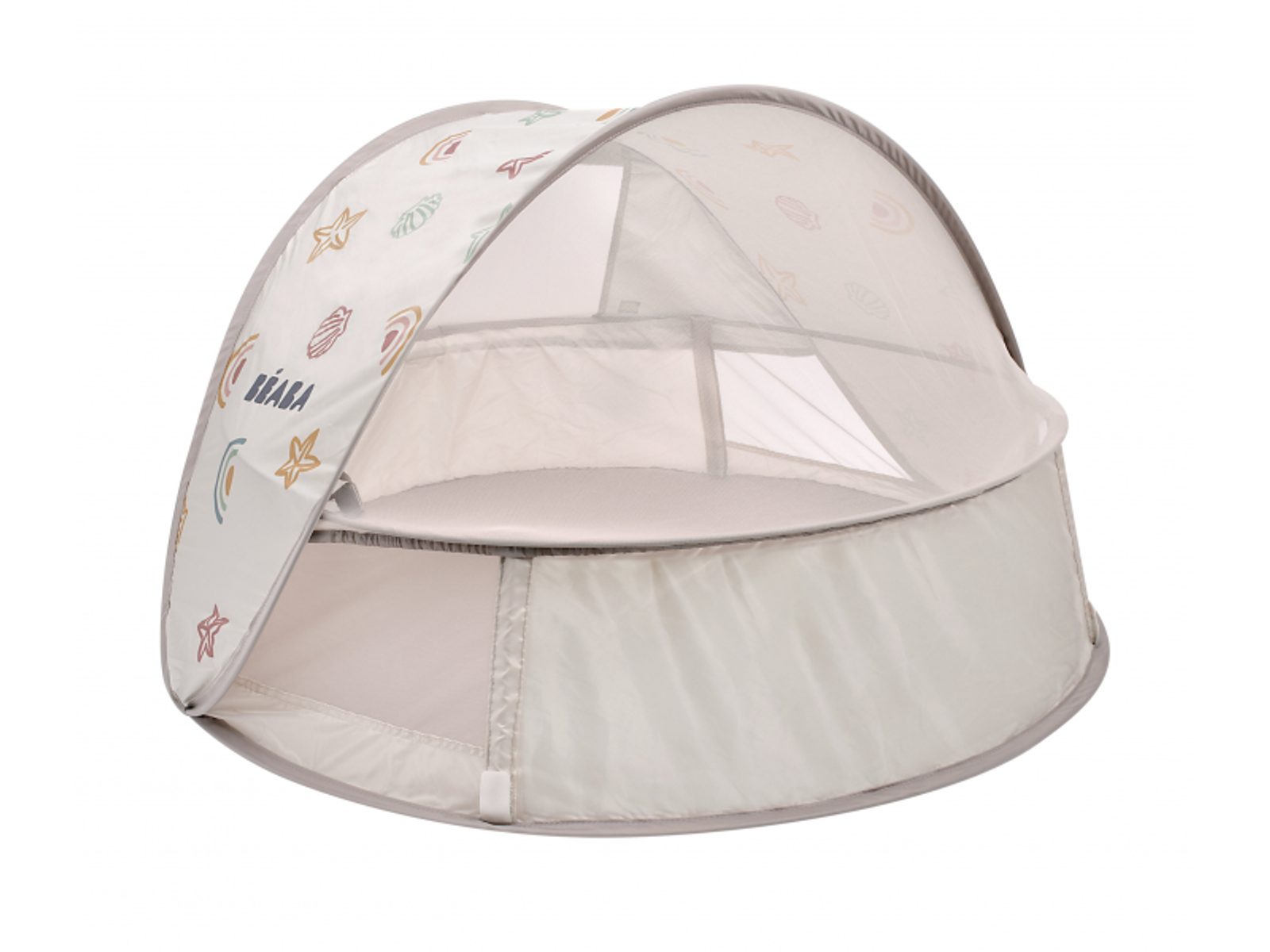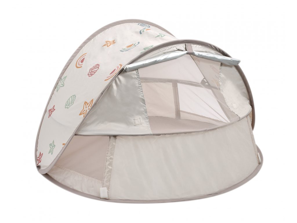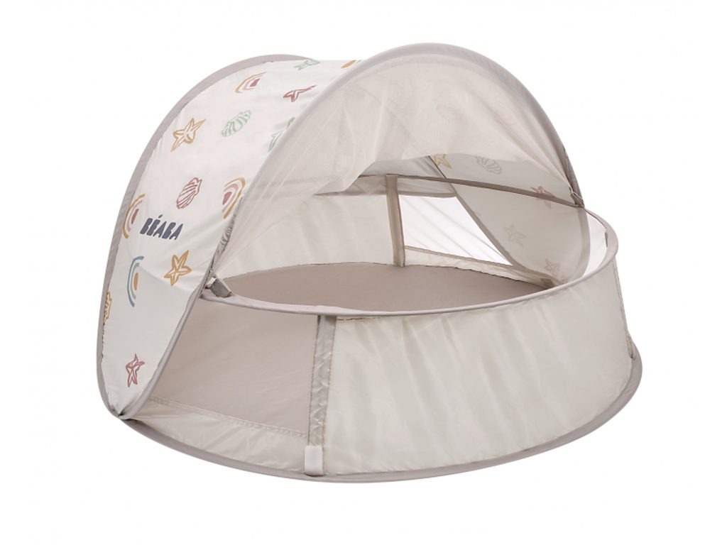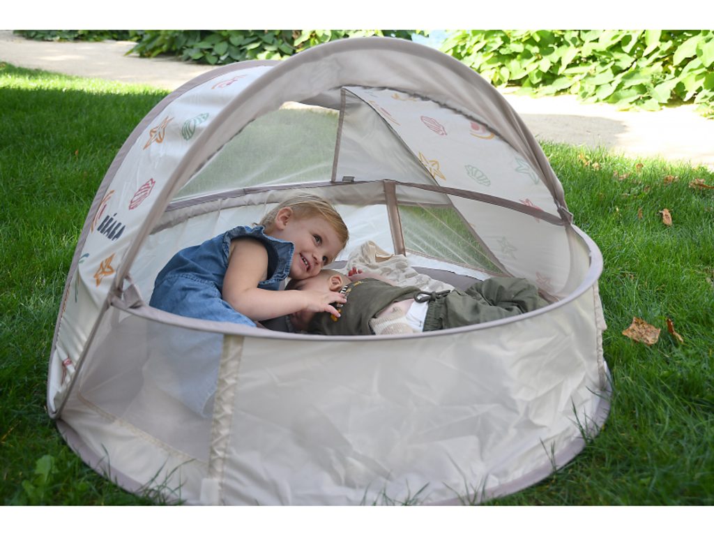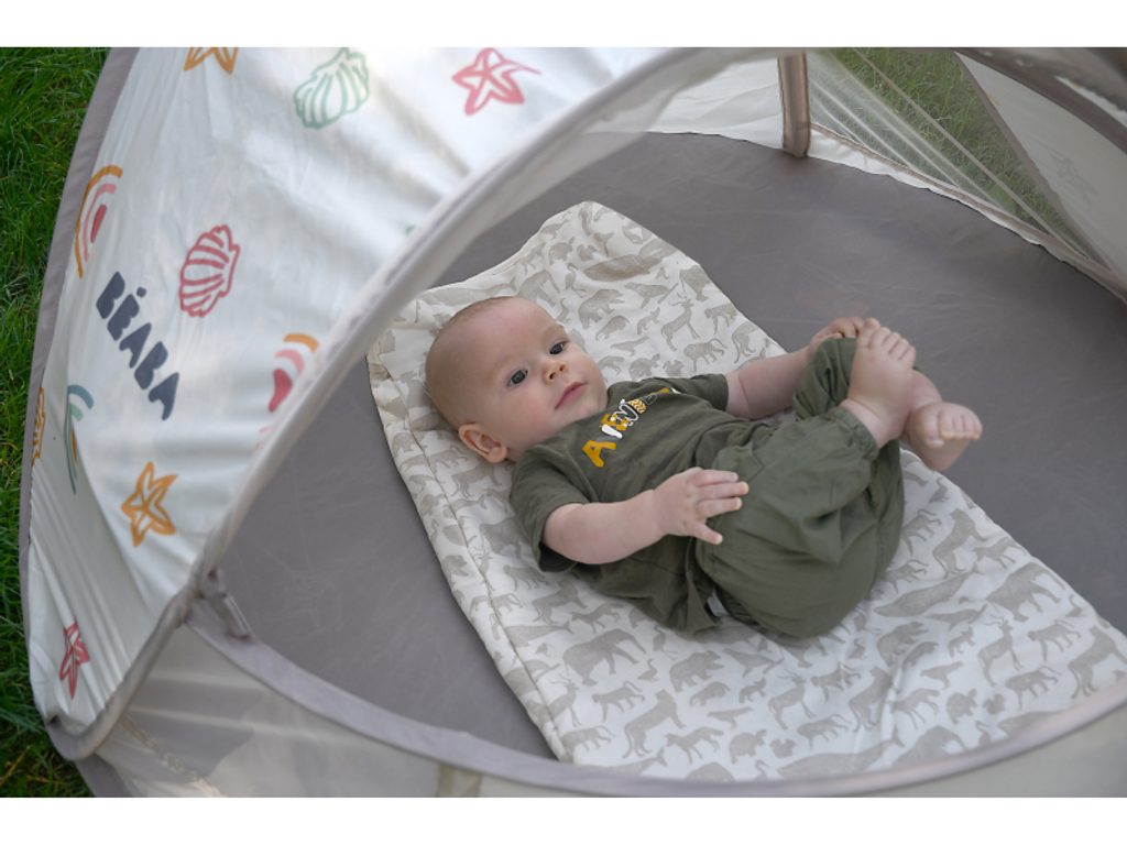 Přenosný univerzální stan s UV faktorem 50+ pro ochranu dítěte před sluncem na zahradě, na pláži či na výletech do přírody. Stan umožňuje snadnou ventilaci díky bočním otvorům se síťovinou a textilními chlopněmi, které je možné srolovat. Síťovina chrání dítě ve stanu před obtížným hmyzem. Tkanina s chladivým efektem pomáhá snižovat teplotu uvnitř stanu. Díky vysokým okrajům stan slouží i jako hrací ohrádka. Stan s vyskakovacím systémem velmi snadno složíte i rozložíte. Po složení do přenosné tašky jej vezmete s sebou kamkoli potřebujete. Příslušenství: taška na přenášení, 4 kolíky pro uchycení stanu. Složení: 100% polyester (bez PFAS) Vhodné pro děti od narození do 24 měsíců.