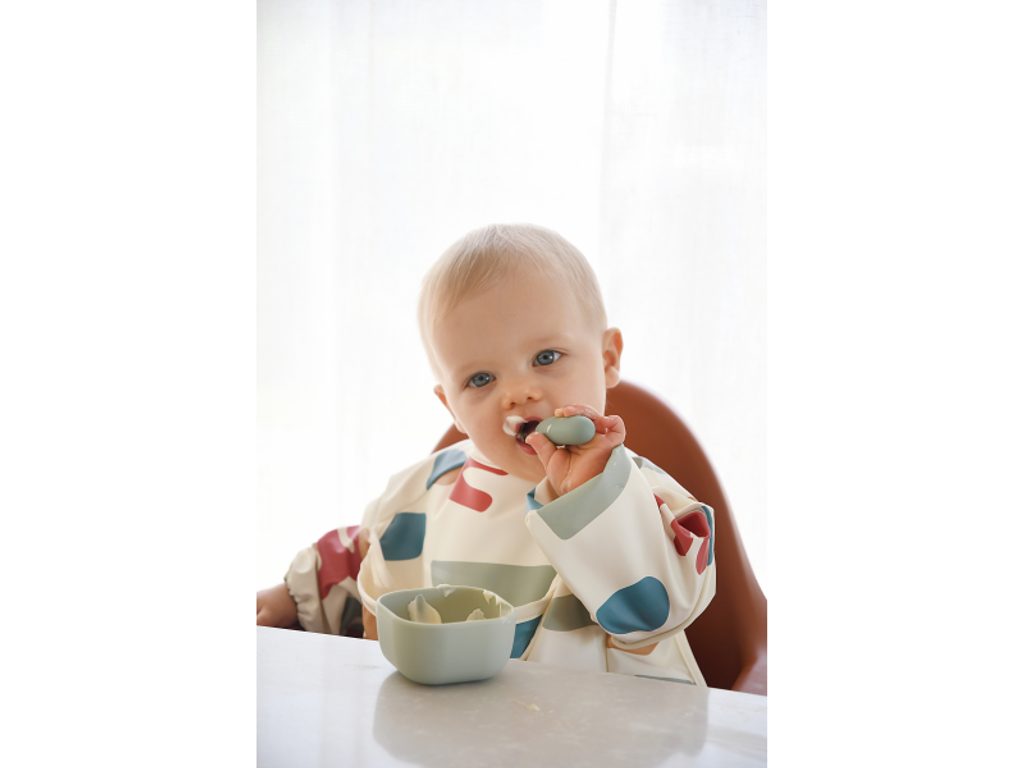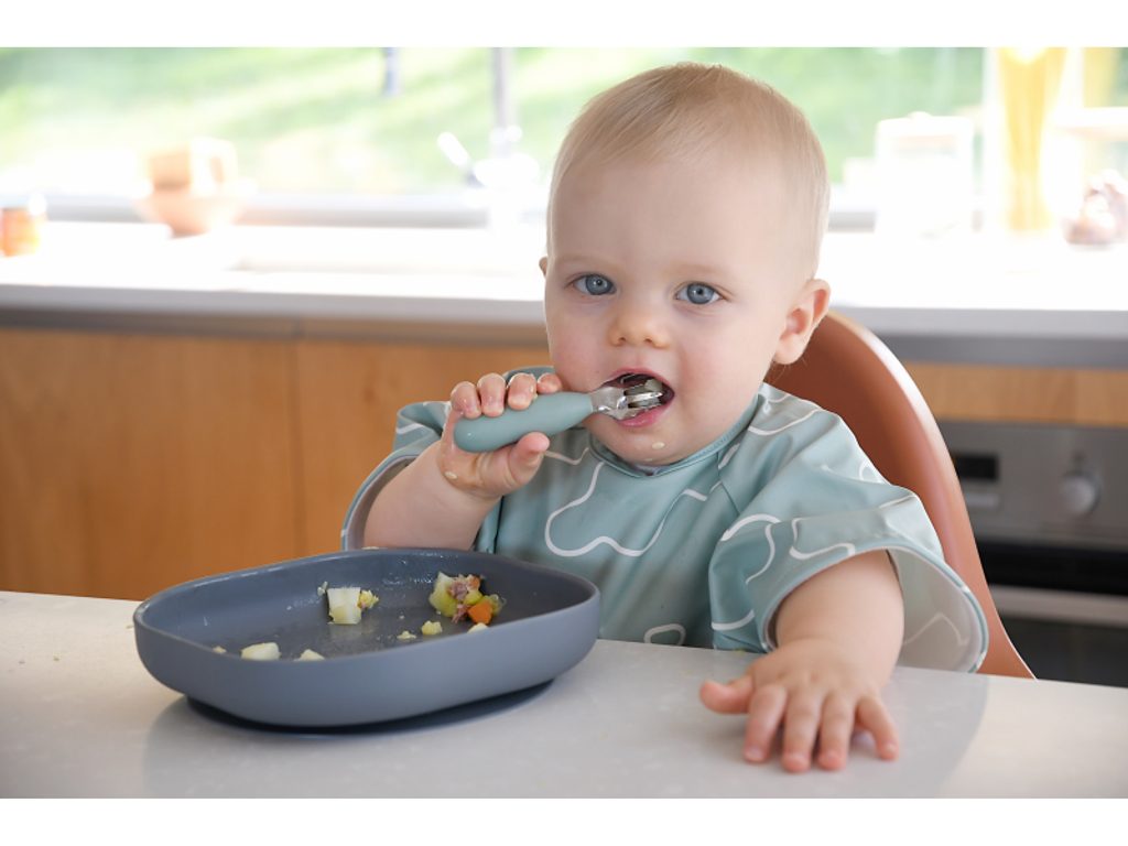První příbor z kvalitní nerezové oceli s plastovou rukojetí usnadní dítěti přechod od krmení lžičkou k používání příboru. Nerezová vidlička a lžička jsou lehké a díky ergonomickému plastovému držadlu snadno uchopitelné dětskýma rukama. Mělká lžička je ideální pro nabrání malého množství příkrmu, které dítě dokáže donést až do úst. Zakulacené hroty vidličky jsou zárukou bezpečného používání. Možno mýt v myčce. Vhodné pro děti od 10 měsíců.
