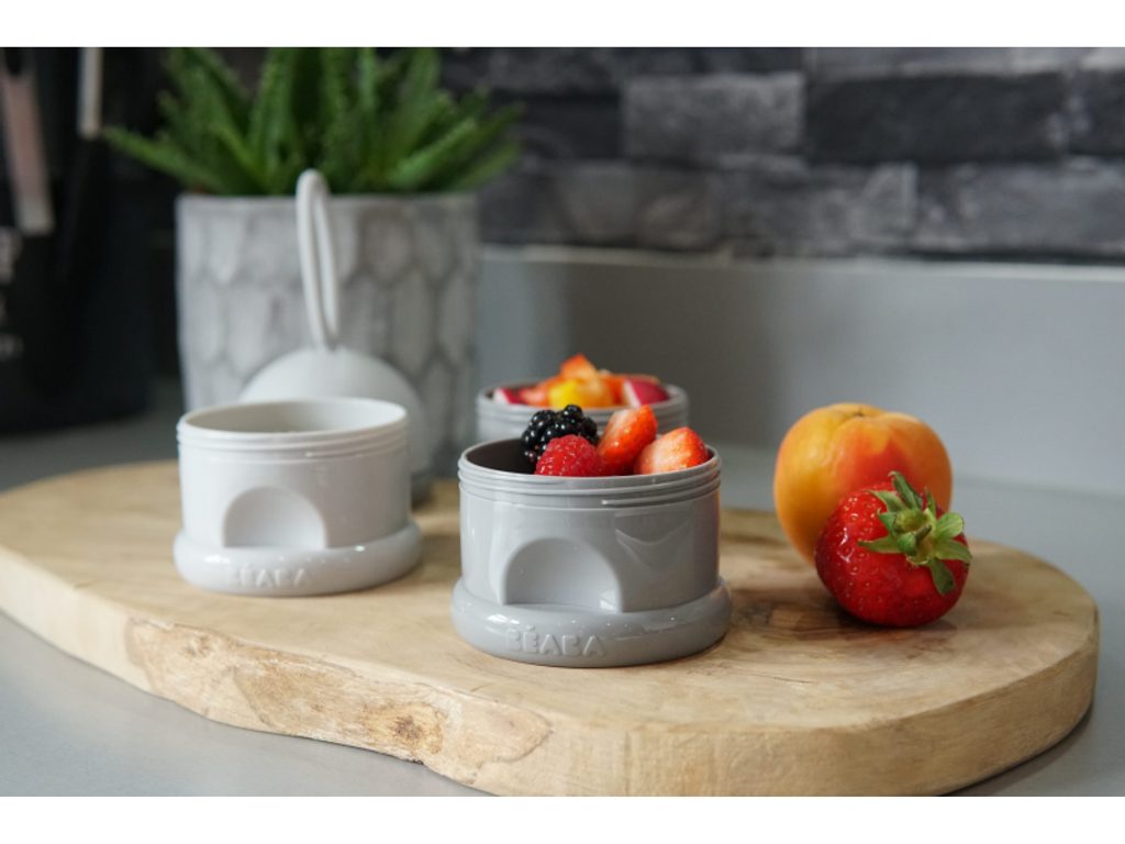 Praktický zásobník Beaba na tři dávky mléka je ideální na cesty či na noc. V připraveném mléce se mléčné bakterie množí velmi rychle, oddělené uchování kojenecké vody a sušeného mléka vám umožní připravit krmení těsně před použitím. Tři kompaktní dávkovače jsou propojené šroubovacím závitem, násypné víčko a ochranné víčko je rovněž šroubovací. Sušené mléko je hygienicky uložené, stačí jen nasypat s pomocí násypného víčka do jakékoli kojenecké láhve bez rizika rozsypání. Ochranné víčko s očkem umožňuje zavěsit celý zásobník kamkoli potřebujete, aby byl po ruce. Ve starším věku dítěte můžete kelímky používat na dětské svačinky. Tři šroubovací kelímky umožňují oddělené uchování jednotlivých částí svačinky, např. kousků ovoce nebo zeleniny, dětských sušenek apod. Možno mýt v myčce.