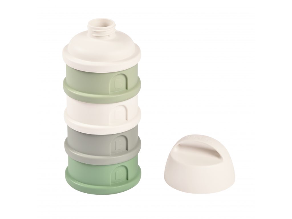 Praktický zásobník Beaba na tři dávky mléka je ideální na cesty či na noc. V připraveném mléce se mléčné bakterie množí velmi rychle, oddělené uchování kojenecké vody a sušeného mléka vám umožní připravit krmení těsně před použitím.  Tři kompaktní dávkovače jsou propojené šroubovacím závitem, násypné víčko a ochranné víčko je rovněž šroubovací. Sušené mléko je hygienicky uložené, stačí jen nasypat s pomocí násypného víčka do jakékoli kojenecké láhve bez rizika rozsypání.  Ochranné víčko s držadlem umožňuje zavěsit celý zásobník kamkoli potřebujete, aby byl po ruce. Ve starším věku dítěte můžete kelímky používat na dětské svačinky. Tři šroubovací kelímky umožňují oddělené uchování jednotlivých částí svačinky, např. kousků ovoce nebo zeleniny, dětských sušenek apod. Možno mýt v myčce.