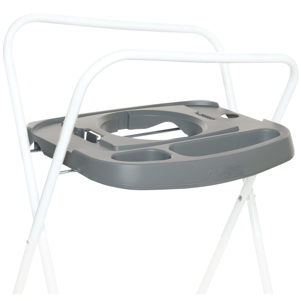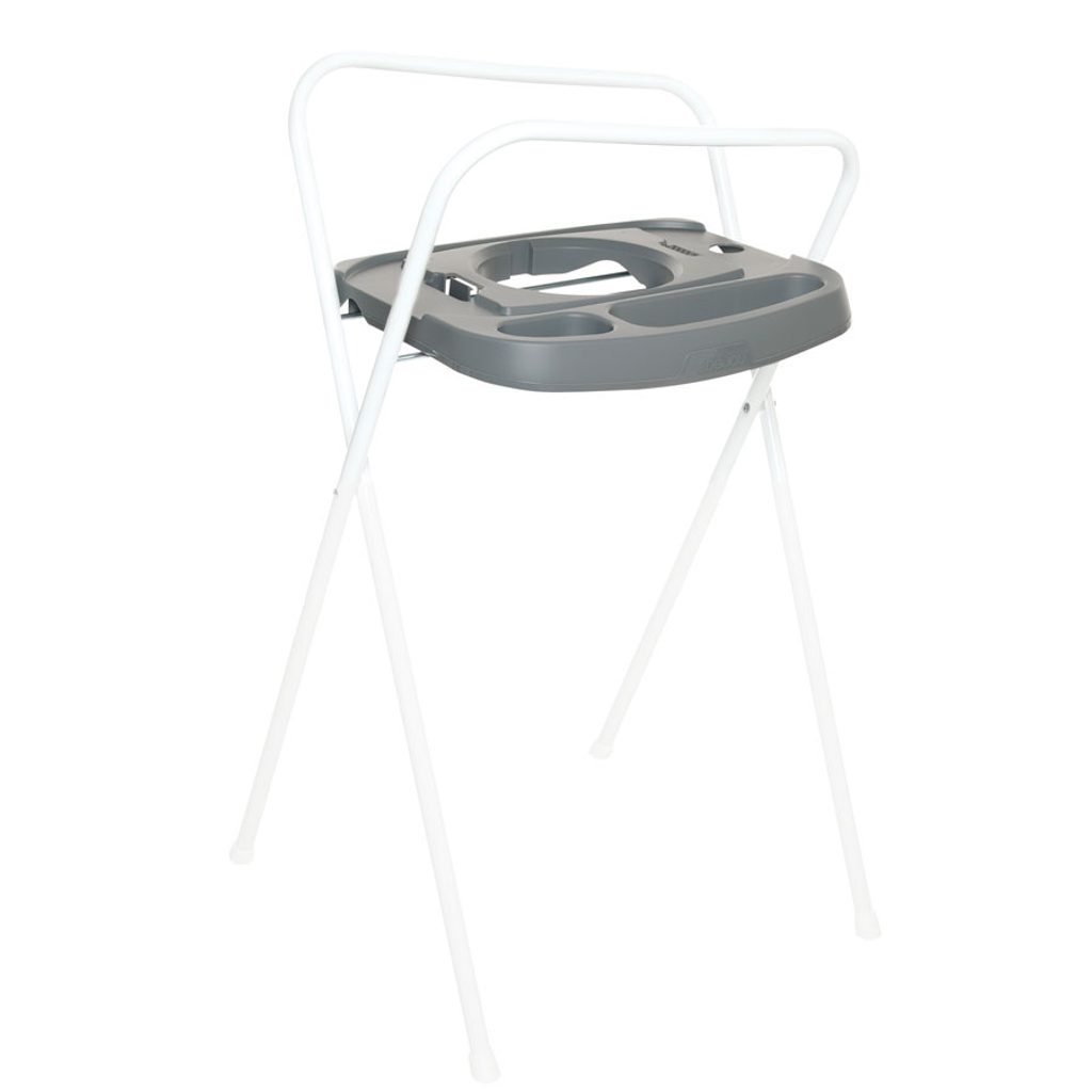Stojan má výšku 98 cm, otvor na zavěšení ručníku a vytvořeno místo na mýdlo. Je skládací a je vybaven inovativním Click systémem. Jen 2 kliknutí a vanička je snadno a bezpečně umístěna na koupací stojan. Stejně snadno může být za pomoci kliknutí vanička ze stojanu odpojena. Také koupací kyblík Bébé-Bubble je možné na tento stojan umístit, takže vám stačí koupit jen 1 stojan a na něj umístit nejprve Bébé-Bubble a potom vaničku.