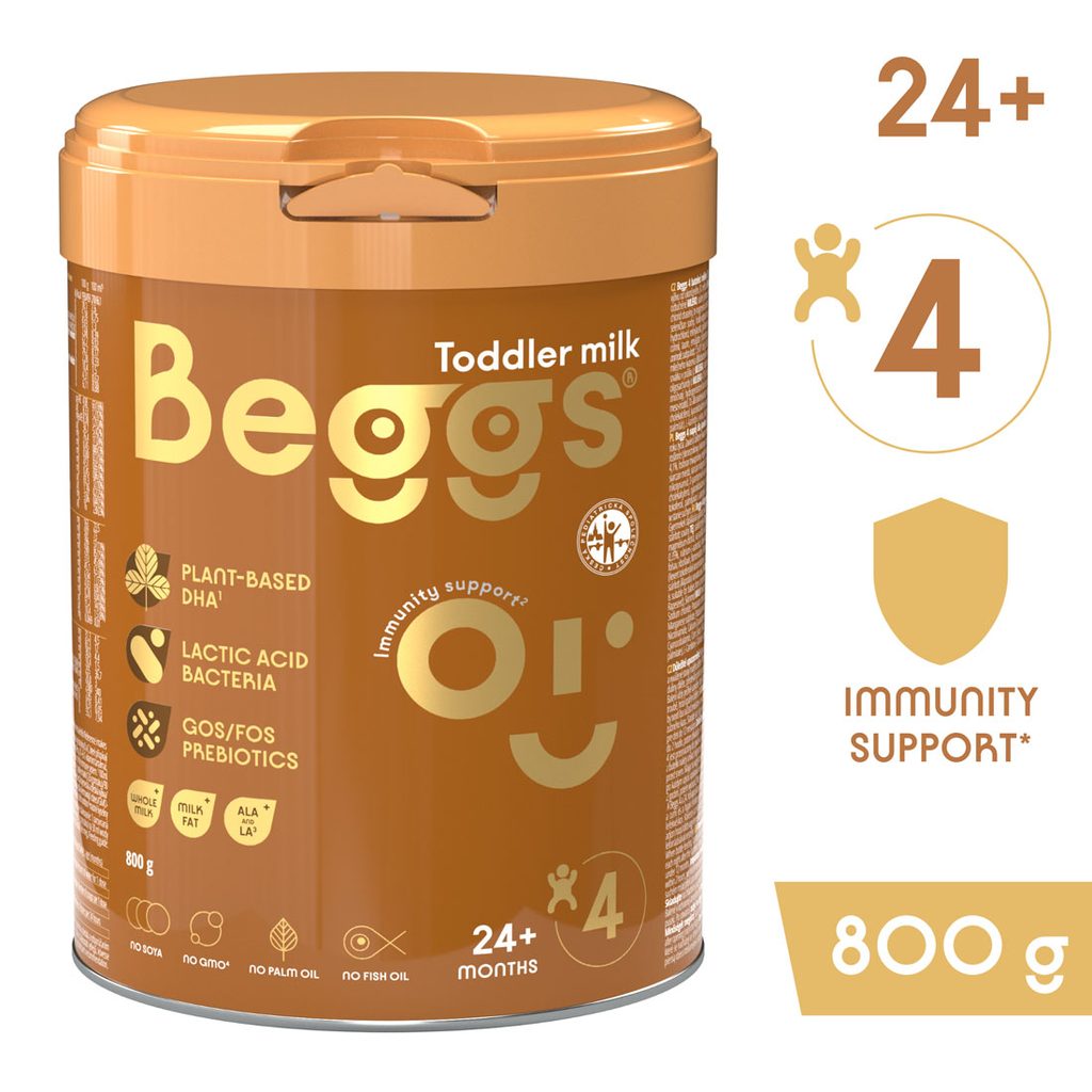 Kojenecké mléko Beggs bylo vyvinuto ve spolupráci s českými a slovenskými rodiči. Obsahuje směs probiotik a prebiotik GOS/FOS. Přidané vitamíny C a D podpoří správnou funkci imunitního systému. Také je obohaceno o plnotučné mléko s kapkou mléčného tuku. Je určeno pro děti od 2 let.