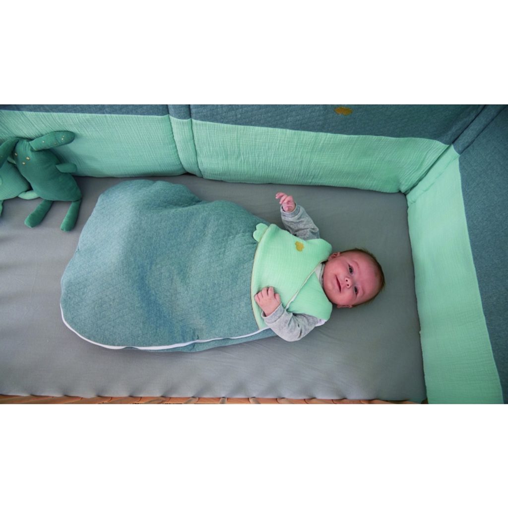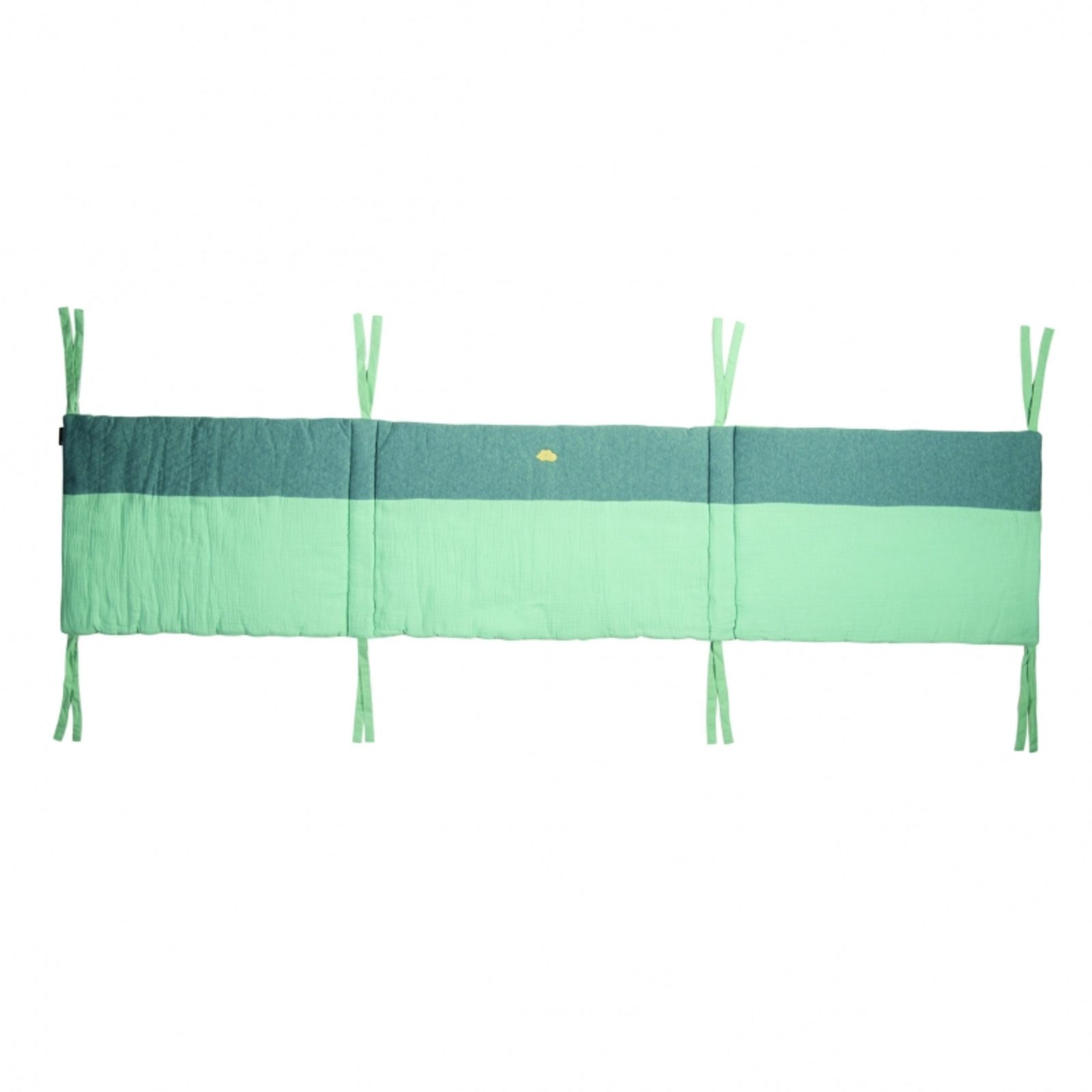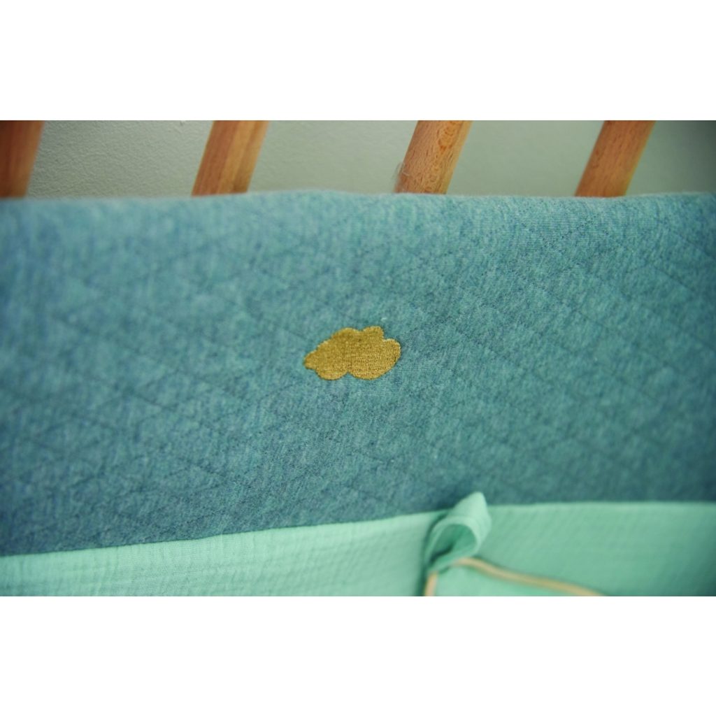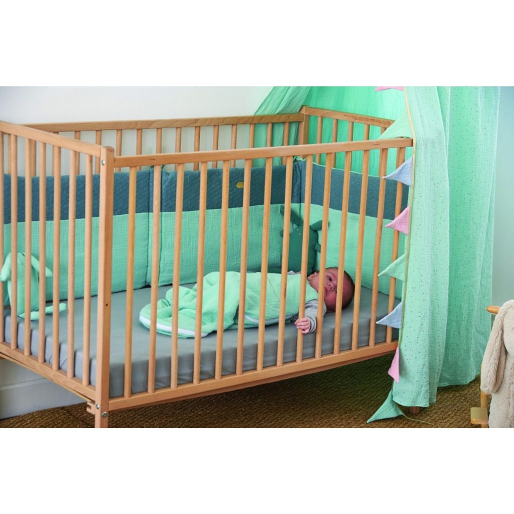 Mantinel na dětskou postýlku z velmi příjemného materiálu zabrání přímému kontaktu s tvrdými lamelami.