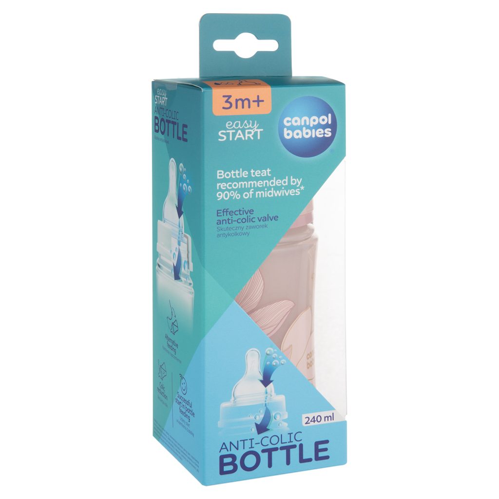 Antikoliková lahvička Canpol babies EasyStart byla vytvořena s ohledem na spokojené bříško vašeho miminka. Speciální antikolikový ventil zabraňuje hromadění vzduchových bublin v mléce, čaji nebo kaši, což v kombinaci se správně zvolenou polohou krmení umožňuje účinně eliminovat břišní diskomfort vašeho dítěte související s kolikou a plynatostí.