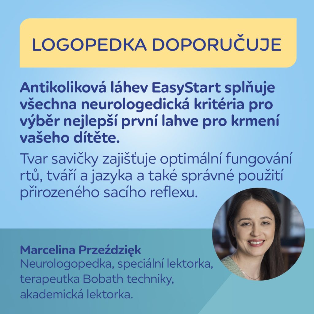 „Lahev EasyStart splňuje všechna neurologopedická kritéria pro výběr nejlepší první kojenecké lahve pro vaše dítě. Tvar savičky zajišťuje optimální fungování rtů, tváří a jazyka a také správnou tvorbu vzoru sání."