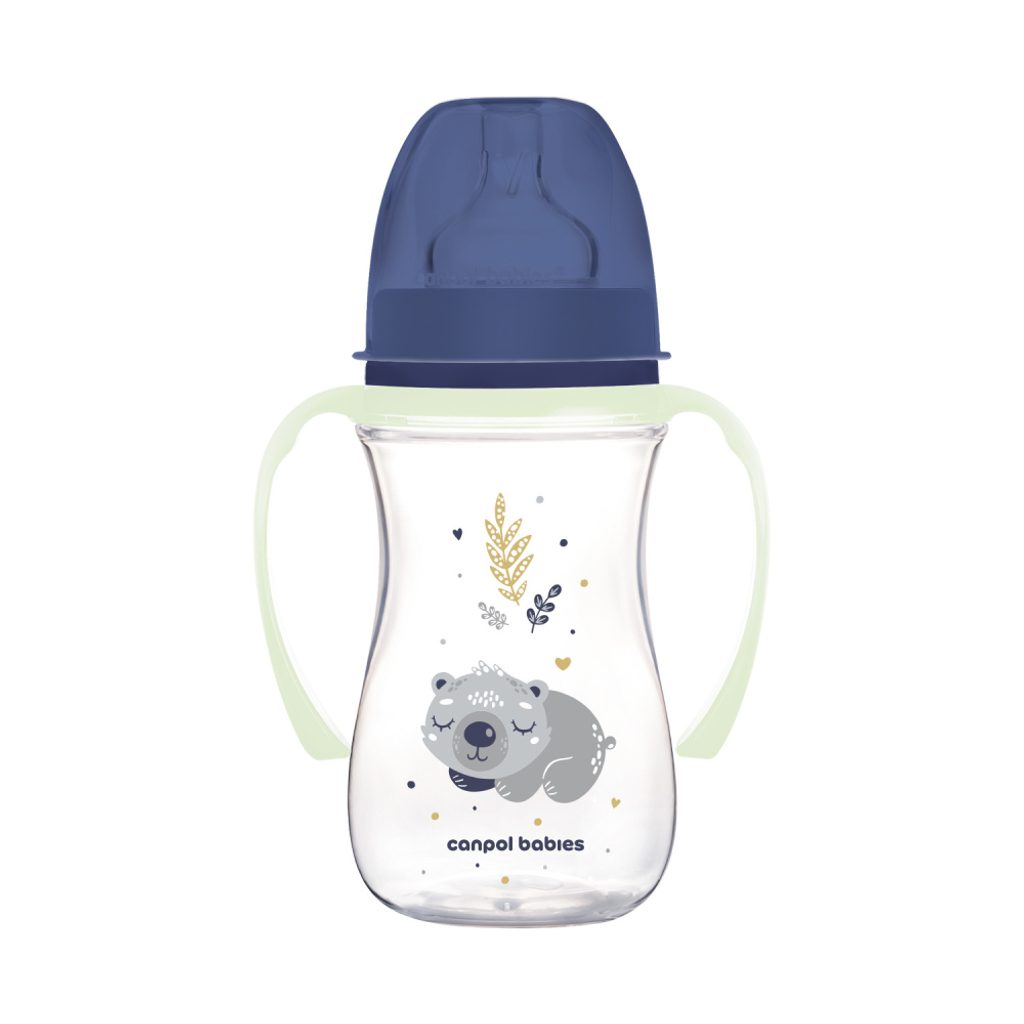 Širokohrdlá antikoliková lahev Canpol babies se svítícími rukojeťmi PP EasyStart 240ml Sleepy Koala je vyrobena z bezpečného a moderního materiálu. Je lehký, odolný a zcela průhledný. Jasná a přesná stupnice vám umožní kontrolovat množství, které vaše dítě vypije, a díky širokému otvoru se lahev snadno čistí a plní.