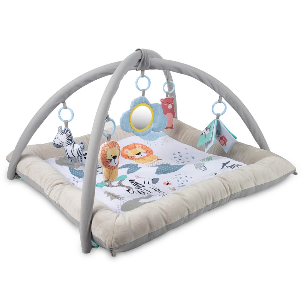 Plyšová edukativní hrací deka s hrazdičkou 0+ SAFARI povzbuzují dítě ke sledování a uchopování. Různé textury stimulují hmat. Pomáhá rozvíjet jemnou motoriku.