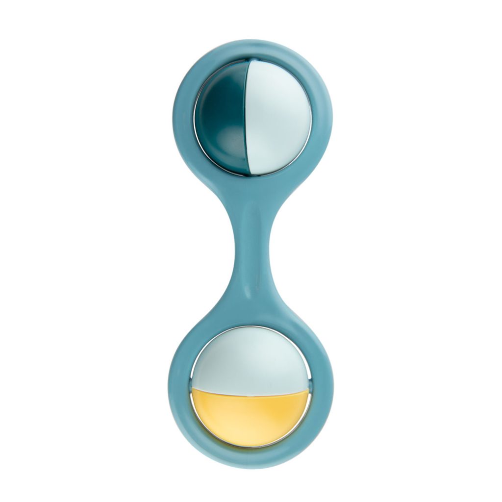 Chrastítko ve tvaru činky s rotujícími prvky je ideální jako první hračka pro nejmenší děti. Je lehounké a praktické, pohodlně se drží v malých dětských ručičkách. Jeho pohyblivé prvky, které se otáčejí a vytvářejí příjemný chrastivý zvuk, ihned zaujmou každé batole. Kontrastní barvy vzbuzují zájem u miminka a rozvíjejí jeho zrak. Hračka je určena pro děti od 0 m a neobsahuje BPA.