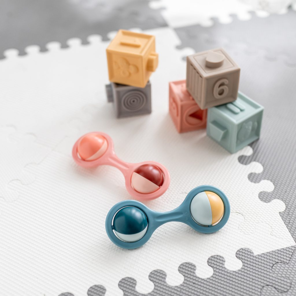 Chrastítko ve tvaru činky s rotujícími prvky je ideální jako první hračka pro nejmenší děti. Je lehounké a praktické, pohodlně se drží v malých dětských ručičkách. Jeho pohyblivé prvky, které se otáčejí a vytvářejí příjemný chrastivý zvuk, ihned zaujmou každé batole. Kontrastní barvy vzbuzují zájem u miminka a rozvíjejí jeho zrak. Hračka je určena pro děti od 0 m a neobsahuje BPA.
