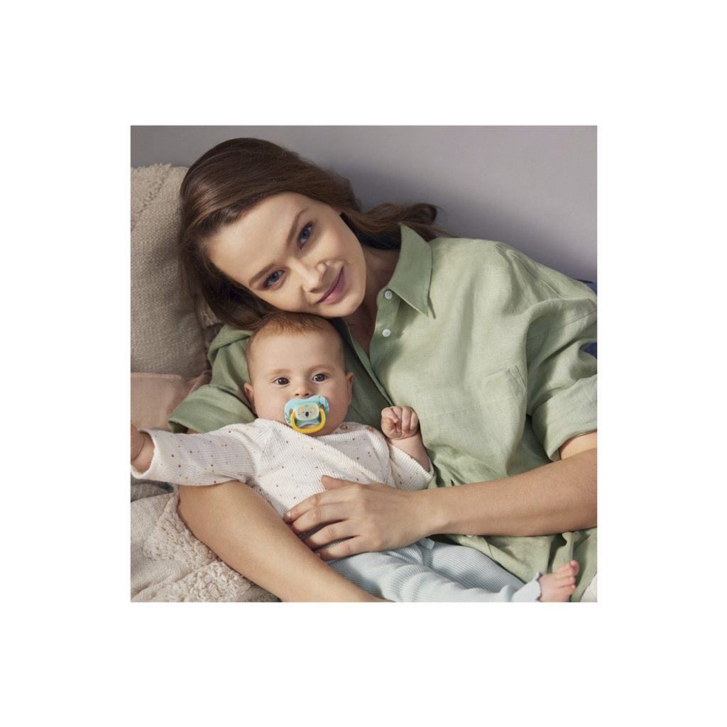 Větrací otvory ve štítu zajišťují volné dýchání a polykání slin. Speciálně navržený tvar štítu minimalizuje otisky dudlíku na jemný obličej dítěte a zabraňuje podráždění. Praktický úchyt na dudlíku umožňuje připevnit dudlík a usnadňuje jeho podávání dítěti. Střed dudlíku ve tmě svítí, což usnadňuje nalezení dudlíku v noci.