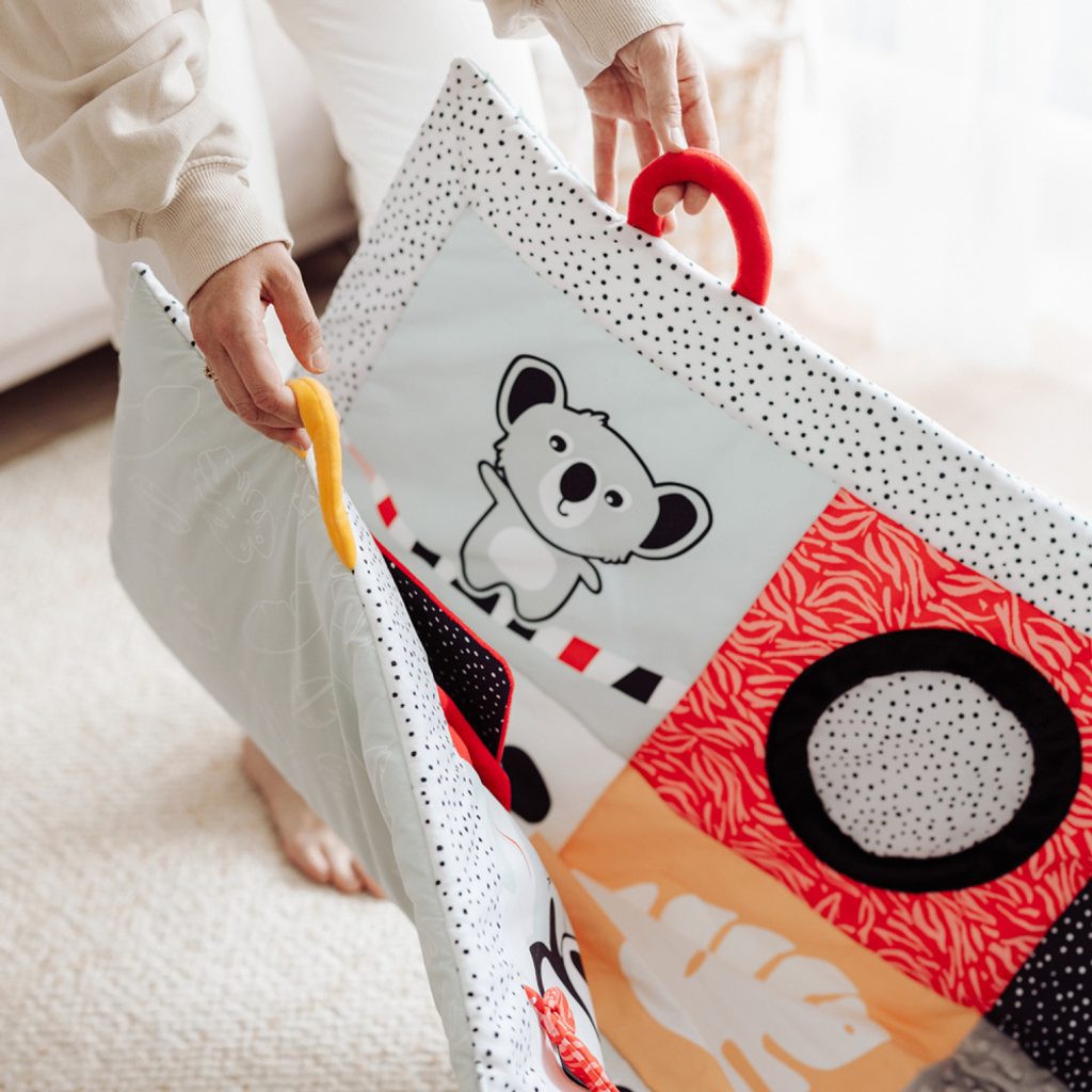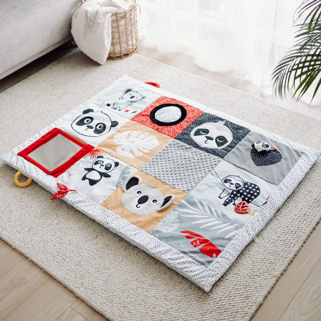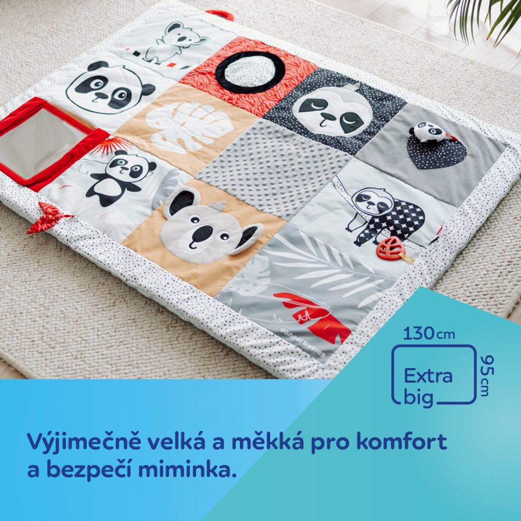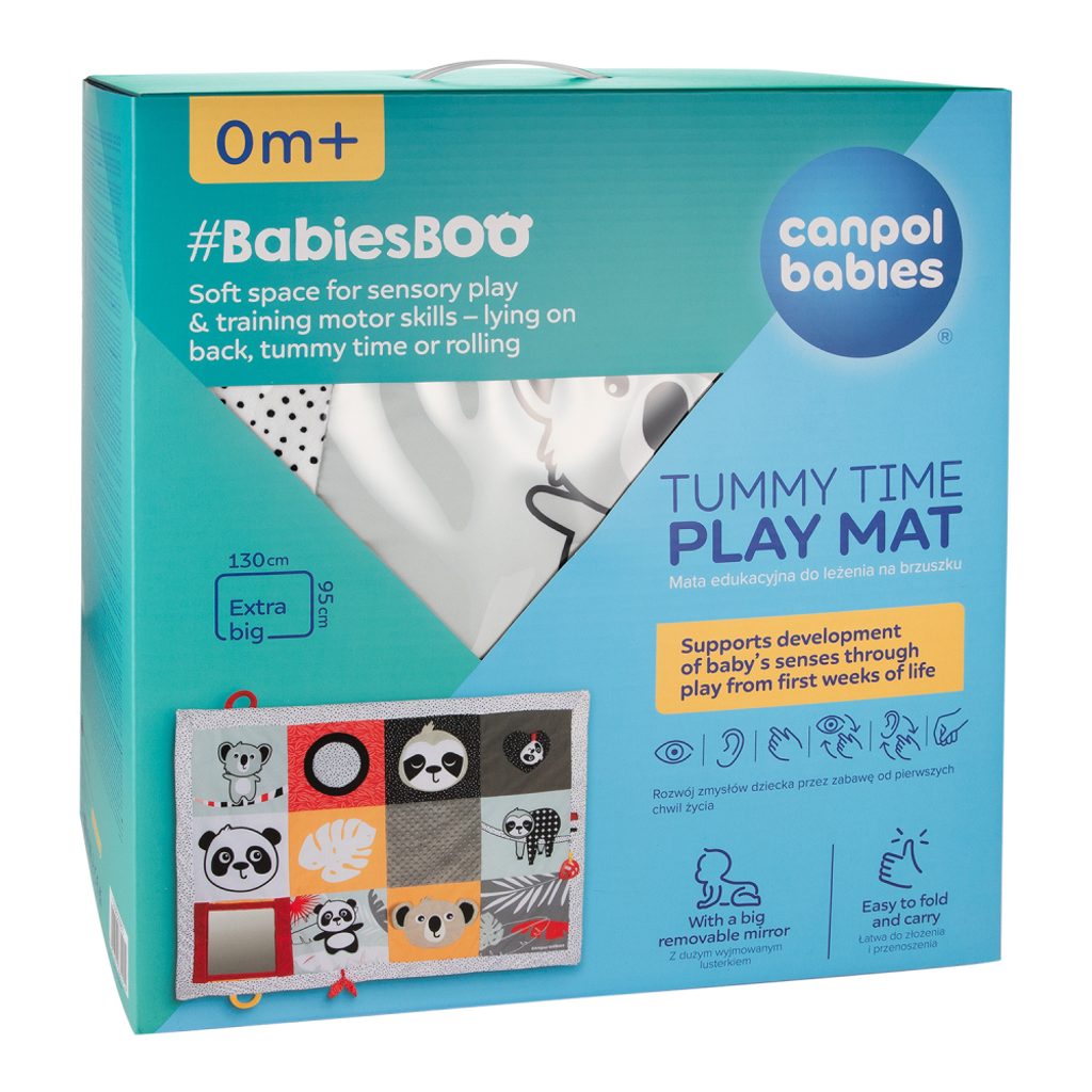Senzorická edukační podložka Canpol babies pro ležení na bříšku z kolekce BabiesBoo je bezpečný a příjemný způsob, jak udržet dítě v pohybu a umožňuje rodiči mít chvilku pro sebe nebo dělat domácí práce. Podložka je výjimečně velká a měkká - 130 x 95 cm poskytne vašemu nejmenšímu pohodlí a bezpečí. Vzdělávací podložka Canpol babies se snadno skládá, má pohodlnou rukojeť, díky které se snadno přenáší, takže můžete vytvořit dětský prostor, kdekoli budete potřebovat. Velké zrcátko povzbuzuje a prodlužuje lezení na bříšku, během kterého může miminko pokaždé prozkoumat různé části podložky. Velké množství smyslových prvků zapojuje dětské smysly: zrak, sluch a hmat. Různé textury materiálů, kontrastní barvy a vzory a jemné zvuky jsou skvělou zábavou pro rozvíjející se smysly vašeho miminka od prvních okamžiků života. Senzorická naučná podložka Canpol babies pomůže zajistit správnou motoriku každého dítěte. Podložku lze prát v pračce.