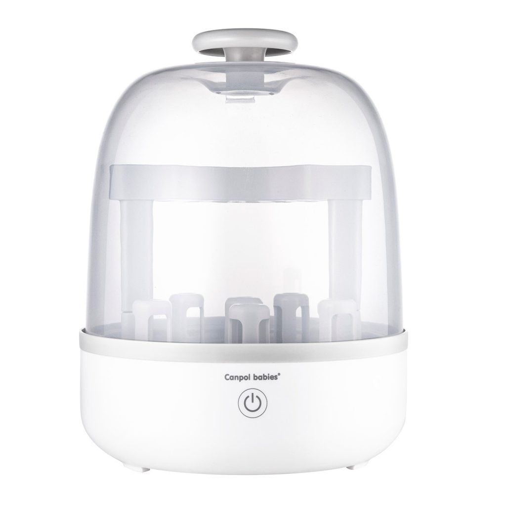 Mimořádně pohodlný a efektivní. To je nový elektrický parní sterilizátor od Canpol babies, který umožňuje snadno a rychle dezinfikovat lahve, příslušenství k odsávačkám a další doplňky potřebné pro každodenní péči o dítě. Vytvořená pára rovnoměrně odstraňuje bakterie a zajišťuje tak perfektní čistotu produktů. Speciálně navržená filtrační nádoba usnadňuje odstraňování vody a nečistot po dokončení procesu dezinfekce. Sterilizátor nevyžaduje žádné další dezinfekční přípravky a disponuje automatickým vypínáním.DOSTUPNOST - LEDEN 2022!RYCHLÝ - dezinfikuje max. 8 min.PROSTORNÝ - pojme až 6 lahví s příslušenstvím.EFEKTIVNÍ - spotřebuje pouze 75 ml vody.BEZPEČNÝ - nevyžaduje žádné další chemické prostředky dezinfekční přípravky, automaticky se vypne.JEDNODUCHÝ A INTUITIVNÍ - vše je ovládáno jedním tlačítkem.2V1 – Elektrický parní sterilizátor a prostorný vysoušeč/organizér na lahve a příslušenství Návod k použití:Před použitím spotřebiče si pečlivě přečtěte všechny pokyny. Tyto pokyny uchovávejte v bezpečí, protože obsahují důležité informace.Účel: Výrobek je určen pro dezinfekci lahví a dalšího drobného příslušenství pro kojence a malé děti. Výrobek je určen pro domácí použití. Dezinfekce se provádí pomocí páry vytvořené z vody při vysoké teplotě. Upozornění: Zařízení produkuje horkou páru. Může způsobit popáleniny. Měli byste být obzvlášť opatrní. Používejte pouze pod dohledem. Chraňte děti před přístupem k zařízení.Canpol babies elektrický parní sterilizátor, který je praktický a účinný, poskytuje maximální hygienu do 8 minut. To umožňuje dezinfikovat až 6 lahví různých velikostí. Balení osahuje: Před prvním použitímVybalte výrobek z obalu. Plastové sáčky mohou být nebezpečné. Aby se zabránilo nebezpečí udušení, uchovávejte je mimo dosah dětí. Důkladně umyjte hlavní část spotřebiče a všechny jeho části v teplé vodě s jemným čisticím prostředkem (neponořujte hlavní těleso přístroje do vody!) A otřete suchým hadříkem. První dezinfekce by měla být provedena bez vložení zařízení, aby se dezinfikoval vnitřek spotřebiče.Před každým použitímDůležité! Před započetím dezinfekce omyjte všechny prvky podle pokynů výrobce a důkladně opláchněte. NIKDY během dezinfekce nezvedejte víko. Pamatujte, že při použití spotřebič obsahuje horkou vodu a páru. Doba cyklu se bude měnit v závislosti na počtu prvků uvnitř. Na konci cyklu se jednotka automaticky vypne. 5krát uslyšíte pípnutí, které označuje konec procesu a indikátor LED zhasne.Po každém použitíNechte spotřebič vychladnout. Před otevřením víka vyčkejte nejméně 3 minuty. Odpojte napájecí kabel a sejměte víko. Neodstraňujte horké komponenty ze sterilizátoru. Po použití spotřebiče a vyjmutí prvků vylijte vodu, která zůstane po procesu, a nádobu opláchněte. Vnitřek těla a nádobu otřete hadříkem, abyste zabránili vzniku vodního kamene nebo sedimentu. Spotřebič se musí nechat vychladnout nejméně 1 hodinu mezi každým použitím. Zajistěte, aby se do zařízení nedostala voda přes ventilační otvory umístěné pod přístrojem.Návod ke skladování.Odpojte zařízení a vyčistěte všechny díly podle výše uvedených doporučení. Přístroj skladujte v krabici nebo na čistém suchém místě. Neukládejte spotřebič do vlhkého nebo prašného prostředí. Nikdy neupevňujte přívodní kabel kolem spotřebiče.ÚDRŽBADoporučuje se používat vařenou nebo filtrovanou vodu, která zabraňuje usazování vápence na součástech zařízení. Pokud k tomu dojde, měl by být odstraněn každé 4 týdny (nebo častěji v závislosti na potřebách), aby byl zajištěn účinný provoz zařízení. Odstraňování vodního kamene může být prováděno výhradně octem. Při jiných čisticích prostředcích by mohlo dojít k nenapravitelnému poškození.Sterilizátor je certifikován a odpovídá požadavkům:Směrnice Evropského parlamentu a Rady 2006/95/ES o harmonizaci právních předpisů členských států týkajících se elektrických zařízení určených pro používání v určitých mezích napětí.Směrnice Evropského parlamentu a Rady 2011/65/EU o omezení používání některých nebezpečných látek v elektrických a elektronických zařízeních.Směrnice Evropského parlamentu a Rady 2004/108/EU o sbližování právních předpisů členských států týkajících se elektromagnetické kompatibility.ISO 9001, ISO 22716