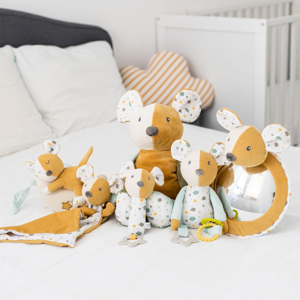 Hebký mazlíček se zrcátkem do auta je součástí stylové kolekce MOUSE. Mazlíček je skvělým kamarádem jak na doma, tak na cestování autem. Umožňuje sledovat dítě za jízdy, navíc rozvíjí jeho schopnost soustředit pozornost. Hračka neobsahuje BPA, doporučený věk 0m+.