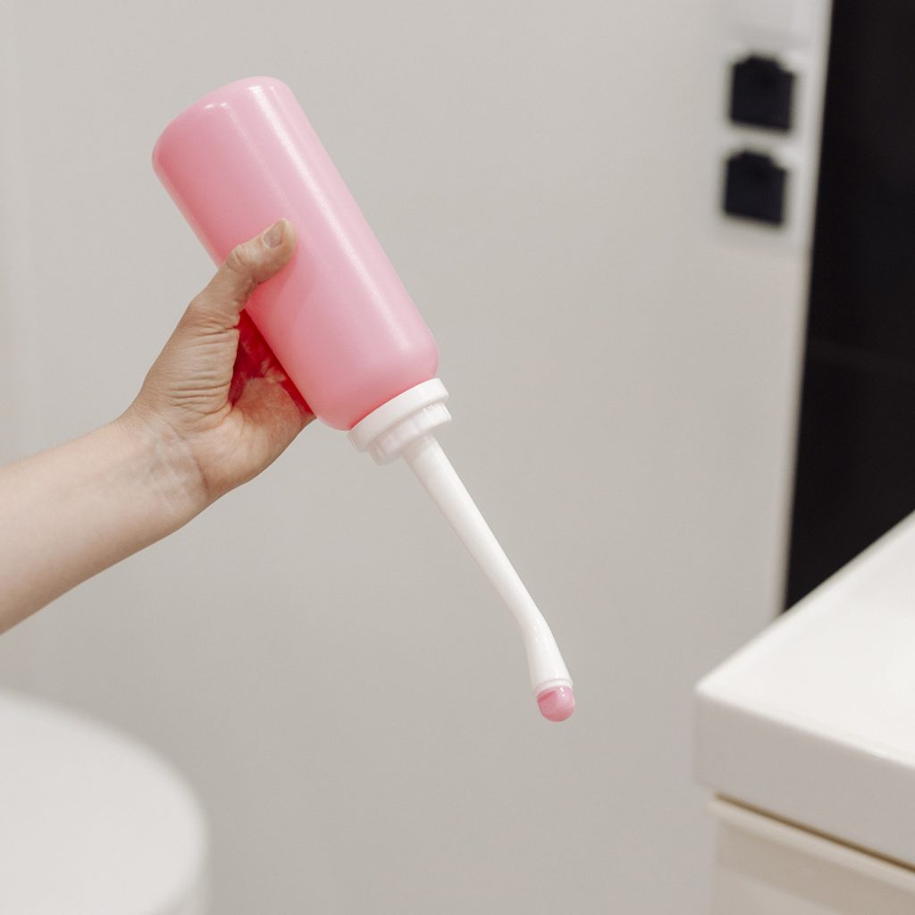 1. Na toaletě nalijte do lahve teplou vodu a pevně zašroubujte uzávěr. Pro pohodlnou aplikaci má lahev dvě koncovky s různými úhly trysek.