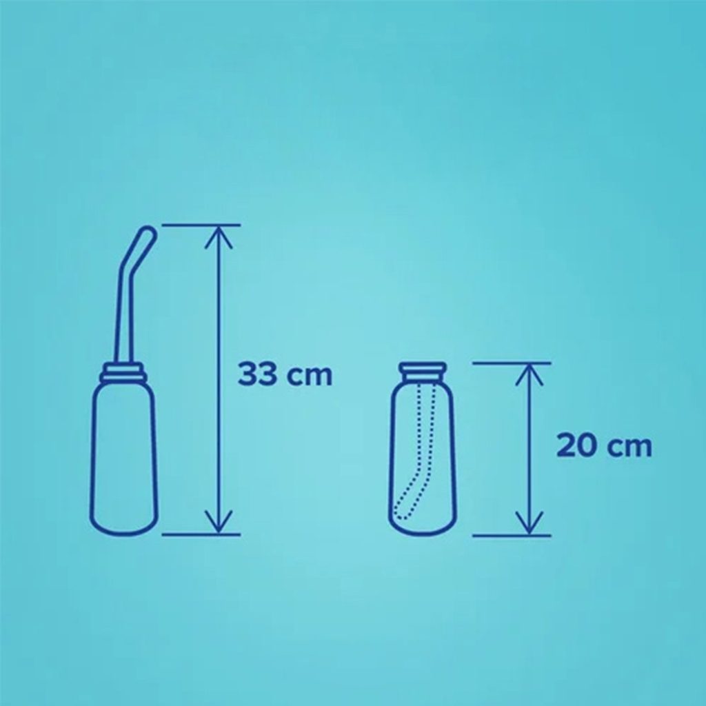 Intimní sprcha je navržena tak, aby pravidelná intimní hygiena byla rychlá a snadná, ať jste kdekoliv: v nemocnici, doma nebo na cestách. Dlouhý nástavec sprchy 17 cm a dvě koncovky s různými úhly trysek umožňují lepší přizpůsobení proudu vody. Po obracení lahve směrem dolů a jejím stlačení vypustí sprcha proud vody pod očekávaným úhlem, a tím se snáze dostanete na těžko dostupná intimní místa. Usnadňuje očištění těžko dostupných partií, aniž byste se museli ohýbat. Zvláště během těhotenství je sprška velmi užitečná, neboť, břicho těhotné ženy může ztížit pravidelné čištění intimních partií.
