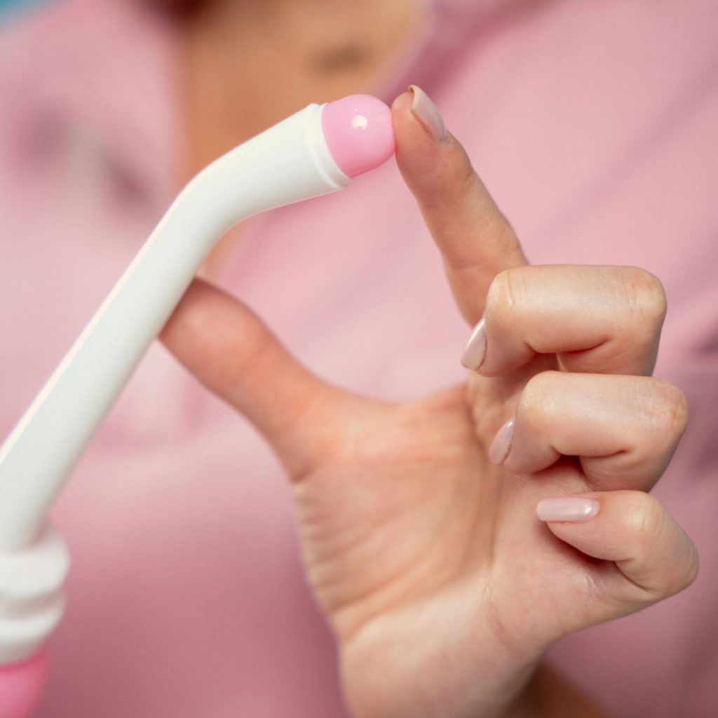 2. Otočte lahvičku dnem vzhůru, namiřte lahev mezi nohy s tryskou směřující směrem k hrázi a jemně lahvičku stiskněte.