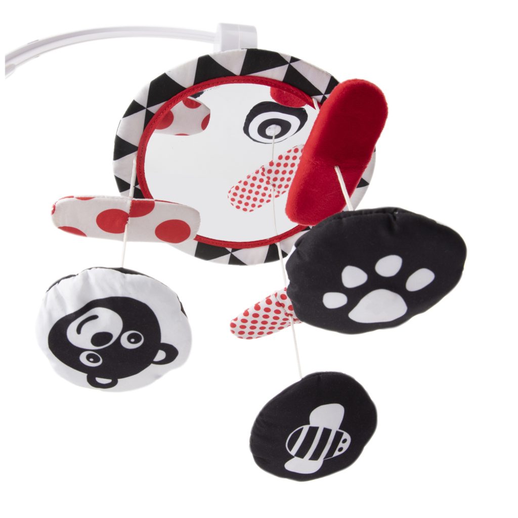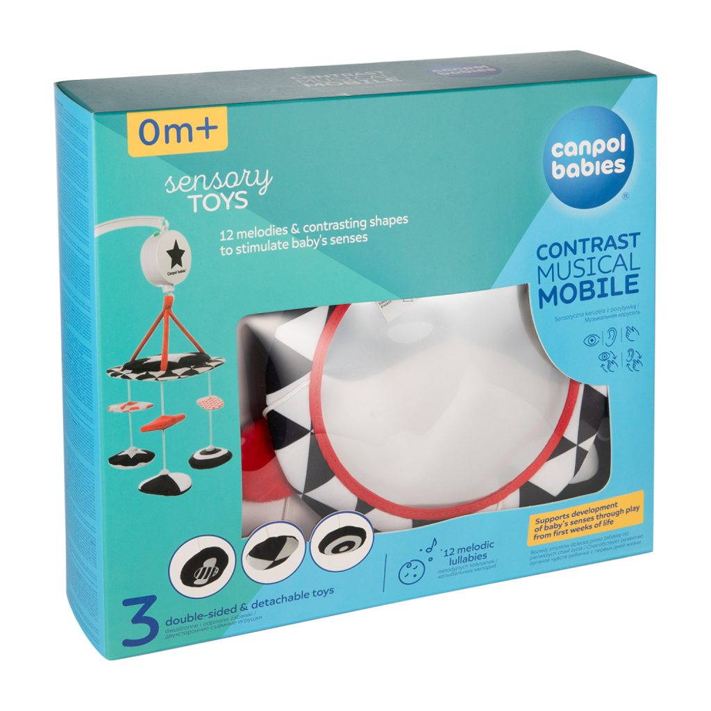 Kontrastní plyšový kolotoč s melodiemi z kolekce SENSORY je určen k připevnění nad postýlku těm nejmenším dětem. Kolotoč je vybaven hudebním strojkem, velkým zrcátkem a plyšovými odnímatelnými elementy s všitým magnetem. Na kolotoči lze pouštět až 12 melodií. Senzorické barvy a melodie stimulují rozvoj smyslů dítěte a jeho vizuálně-sluchovou koordinaci.