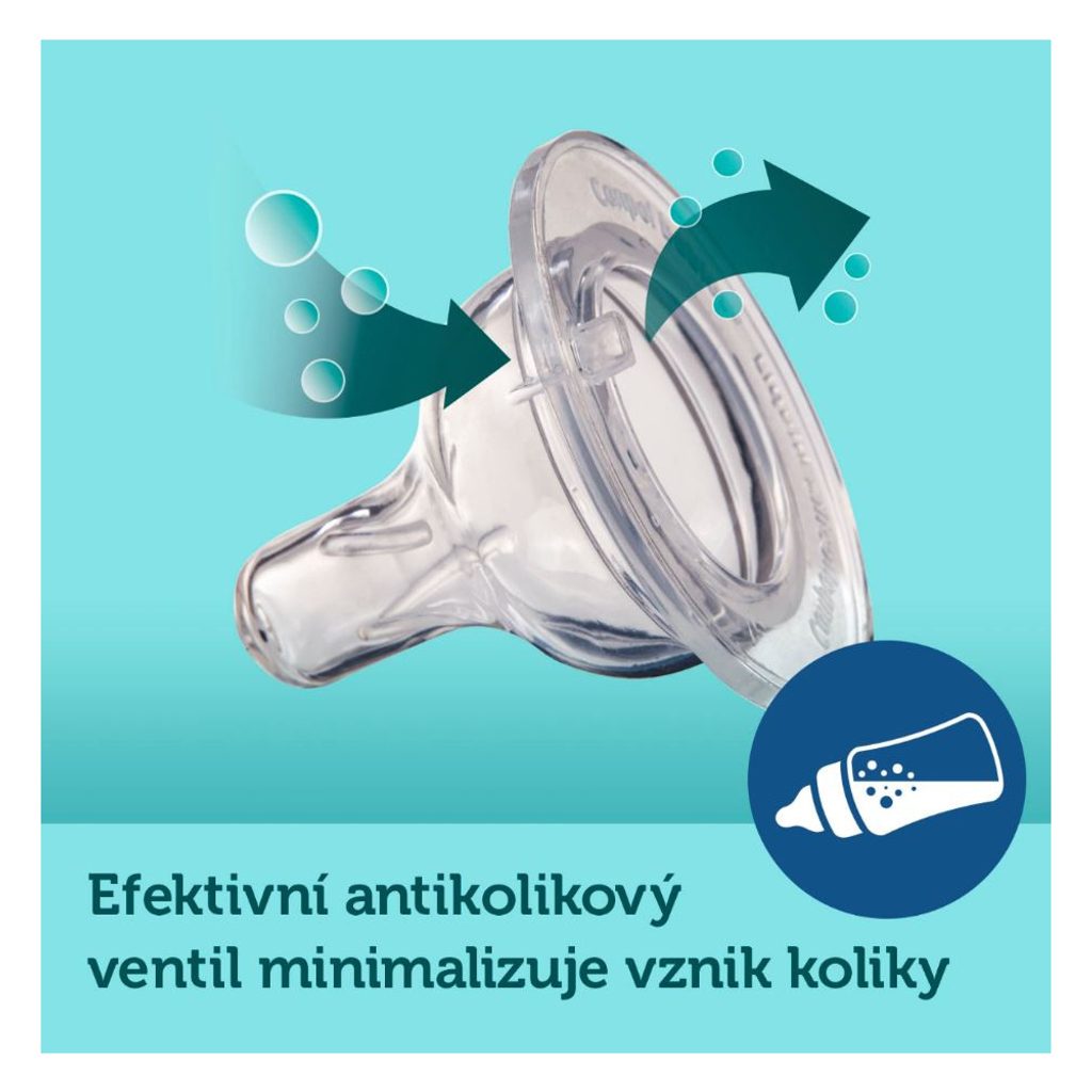 Nový anti-kolikový ventil zabraňuje tvorbě vzduchových bublin v mléce, minimalizuje vznik koliky, polykání vzduchu a hromadění plynů.