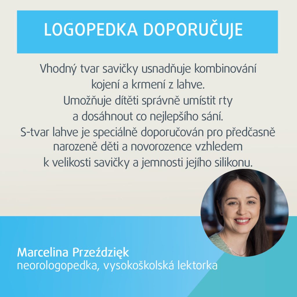 Ergonomický tvar lahve je pohodlný nejen pro miminko, ale také pro rodiče. Při krmení z lahve ve tvaru S zaujímá rodič správnou polohu a dítě nemusí nadměrně zaklánět hlavičku, což je velmi důležité ve fázi samostatného krmení z lahve.