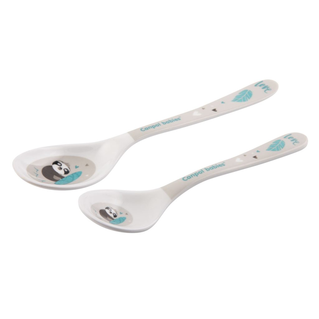 Vyrobeny z melaminu, materiálu odolného proti poškrábání. Zaoblené tvary nedráždí jemné dětské dásně. Lžičky mají barevné potisky, které jsou pro děťátko dalším lákadlem během jídla. Sada se skládá ze dvou čajových lžiček: malá a velká. Vhodné pro děti 9-ti měsíců. Lze umývat v myčce na nádobí, neobsahují BPA.