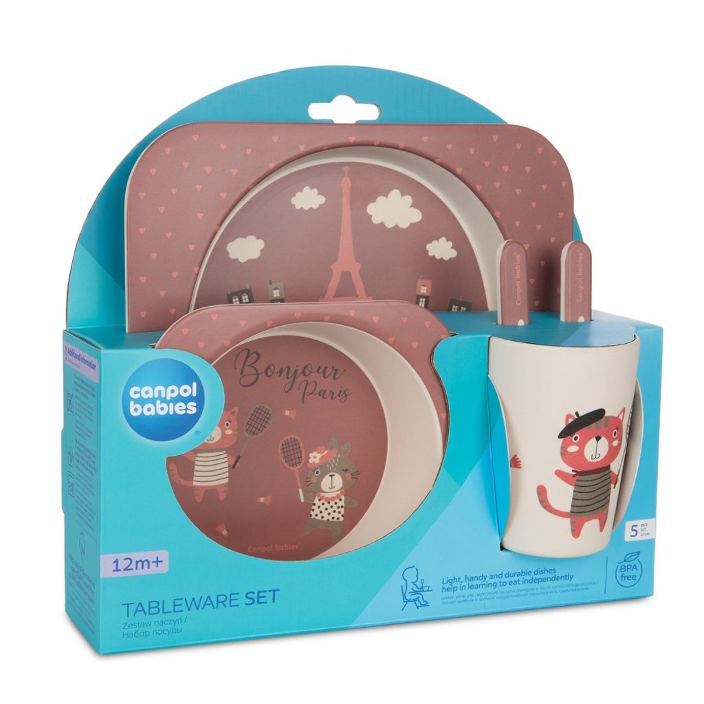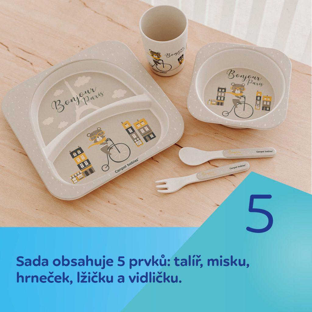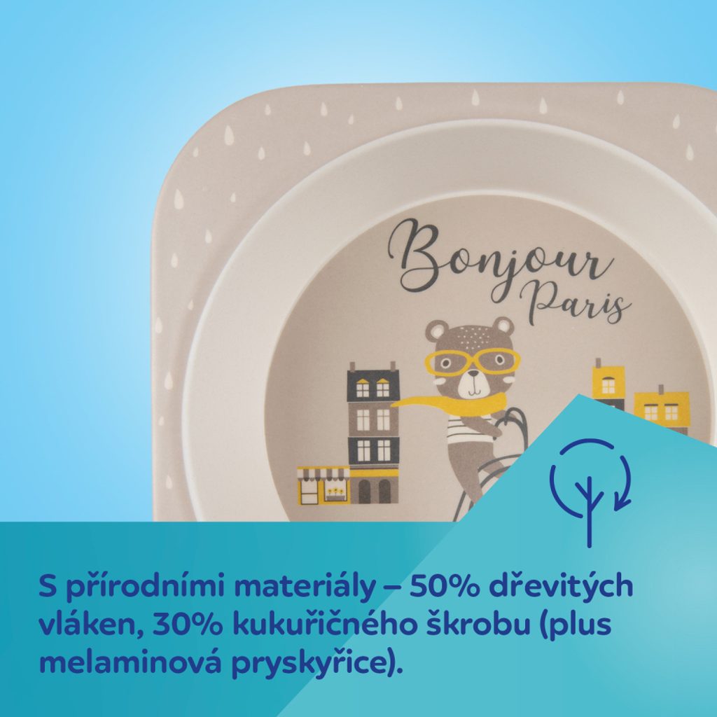Sada nádobí BONJOUR PARIS je ekologickou alternativou klasických talířů a misek z plastu. Sada nádobí je vyrobena z pevného, odolného, nerozbitného materiálu vhodného pro styk s potravinami, za použití přírodních surovin – 50 % dřevitých vláken a 30 % kukuřičného škrobu (a 20 % melaminové pryskyřice).Sada obsahuje: talíř, misku, hrnek a příbor – vidličku a lžíci. Příbor má zaoblené hrany, díky čemuž je bezpečný pro dětská ústa a jemné dásně. Sada dětského nádobí BONJOUR PARIS s roztomilými potisky povzbudí vaše dítě k jídlu. Sada dětského nádobí Canpol babies z kolekce BONJOUR PARIS je ideální pro děti od 12 měsíců, které se učí samy jíst a pít. Lze mýt v myčce za použití nebarvených tablet do myčky a jemných mycích prostředků. Sada nádobí pro miminka BONJOUR PARIS se bude skvěle hodit doma, na dovolené nebo na pikniku.