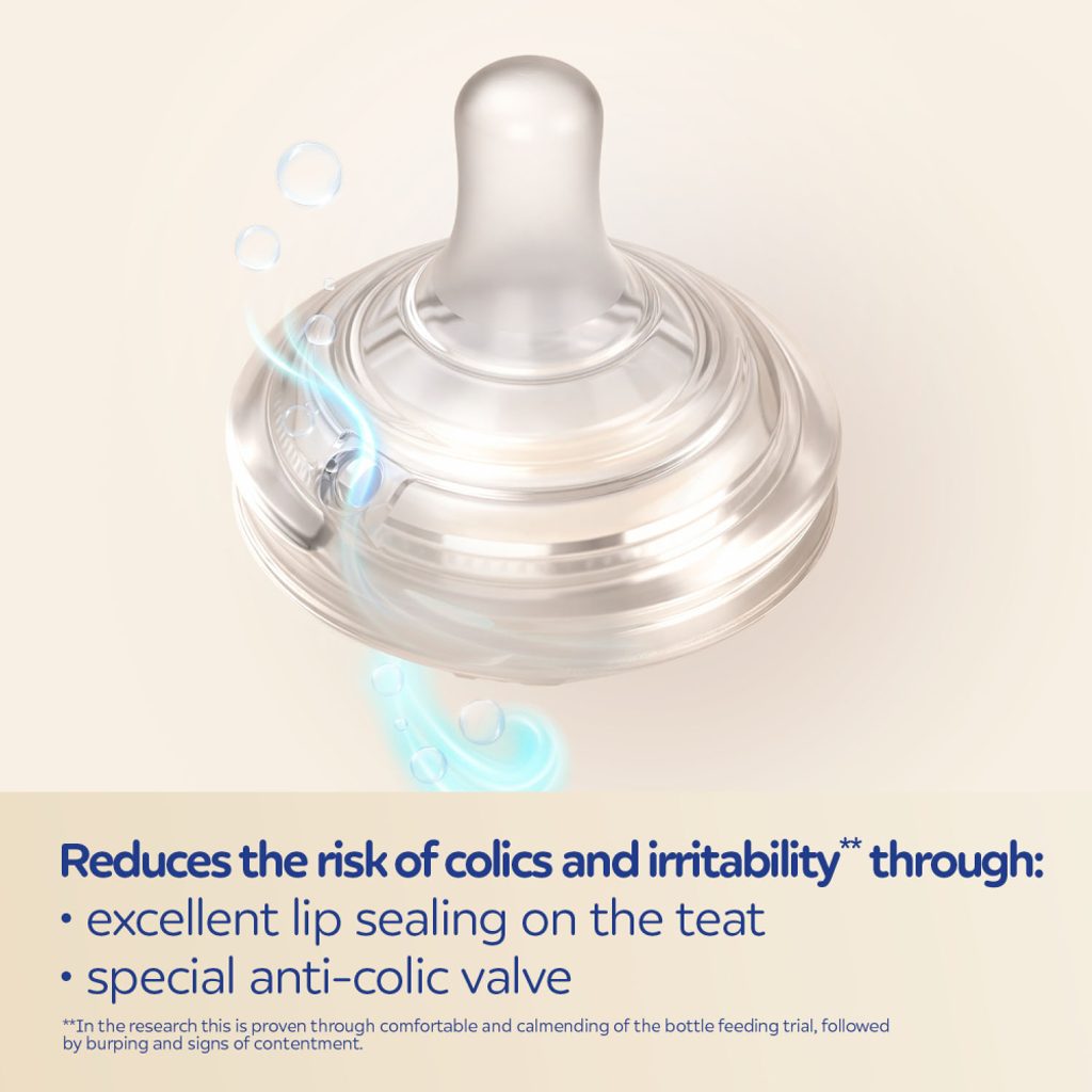 Inovativní antikoliková dvouzónová savička Natural Shape s technologií DuoFlex respektuje přirozený rytmus sání dítěte.