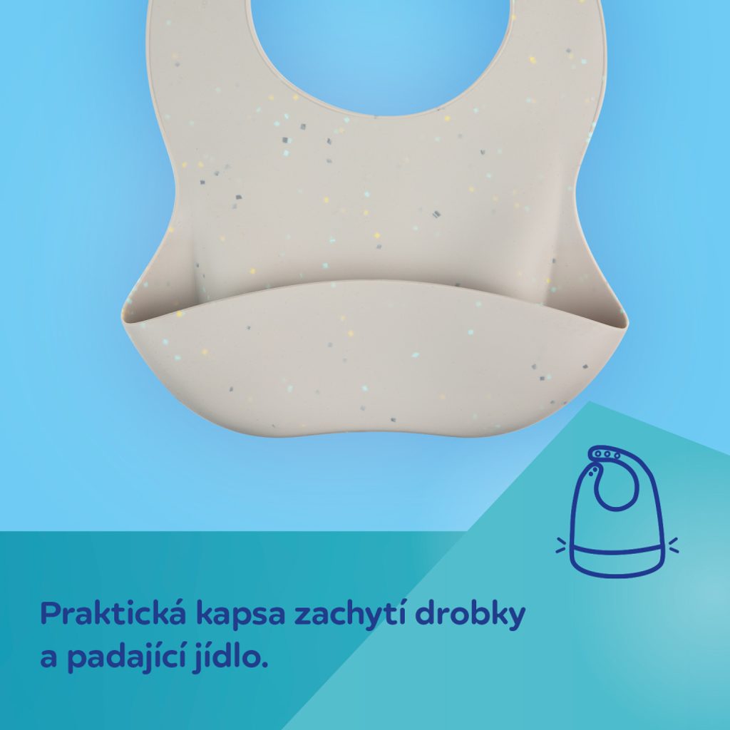 Vodotěsný silikonový bryndáček s kapsou je nezbytný při rozšiřování jídelníčku vašeho miminka a při prvním samostatném krmení. Dokonale ochrání oblečení vašeho dítěte před ušpiněním a mokrem při jídle. Je lehký, měkký, pružný a příjemný na dotek.