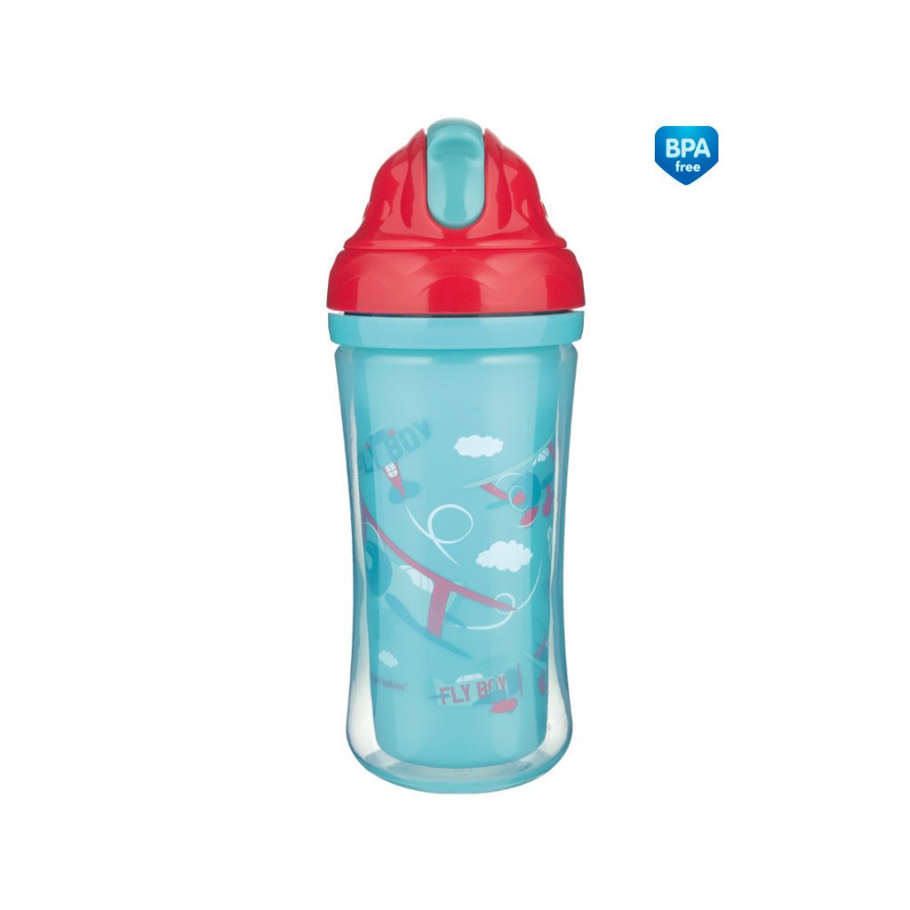 Praktická barevná láhev se silikonovou nevylévací slámkou je určena pro děti starší 12-ti měsíců, které již umí samy pít. Profilovaný tvar láhve usnadňuje uchopit láhev do malých dětských rukou. Ideální na cestování nebo procházky. Měkká silikonová slámka je bezpečná pro citlivé dětské dásně. Membrána ve slámce zabraňuje vytékání tekutiny pokud je láhev nesena dnem vzhůru nebo je upuštěna. Tekutina vytéká pouze tehdy, pokud dítě saje ze slámky. Průtok tekutiny závisí na intenzitě sání dítětem. Silikonová slámka je spojena s plastovou slámkou, která vede na dno láhve a usnadňuje vypití nápoje. Slámka není určena dětem mladším 6-ti měsíců. Láhev je vyrobena z bezpečného materiálu, který je odolný proti poškození. Víčko chrání pítko před znečištěním. Objem 260 ml. Láhev neobsahuje BPA.