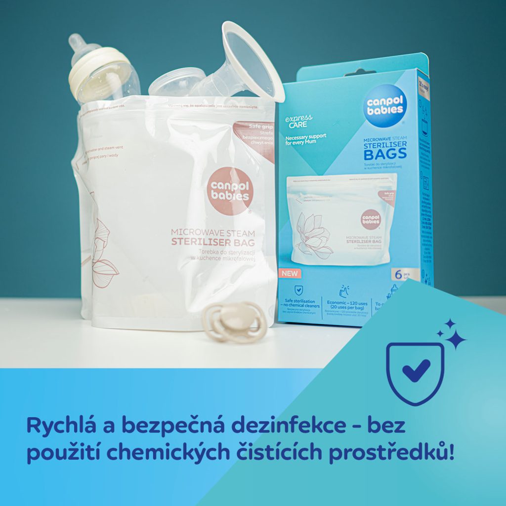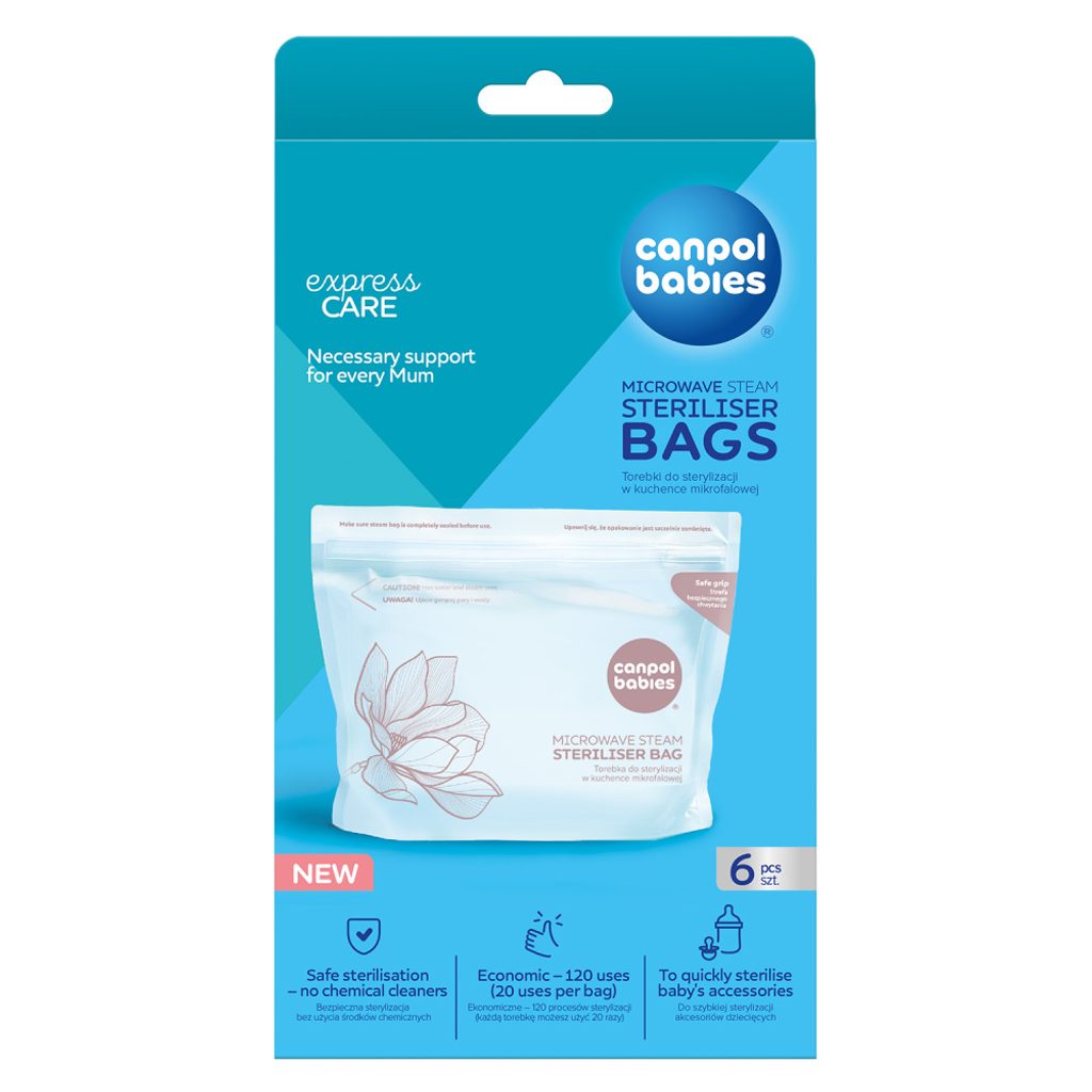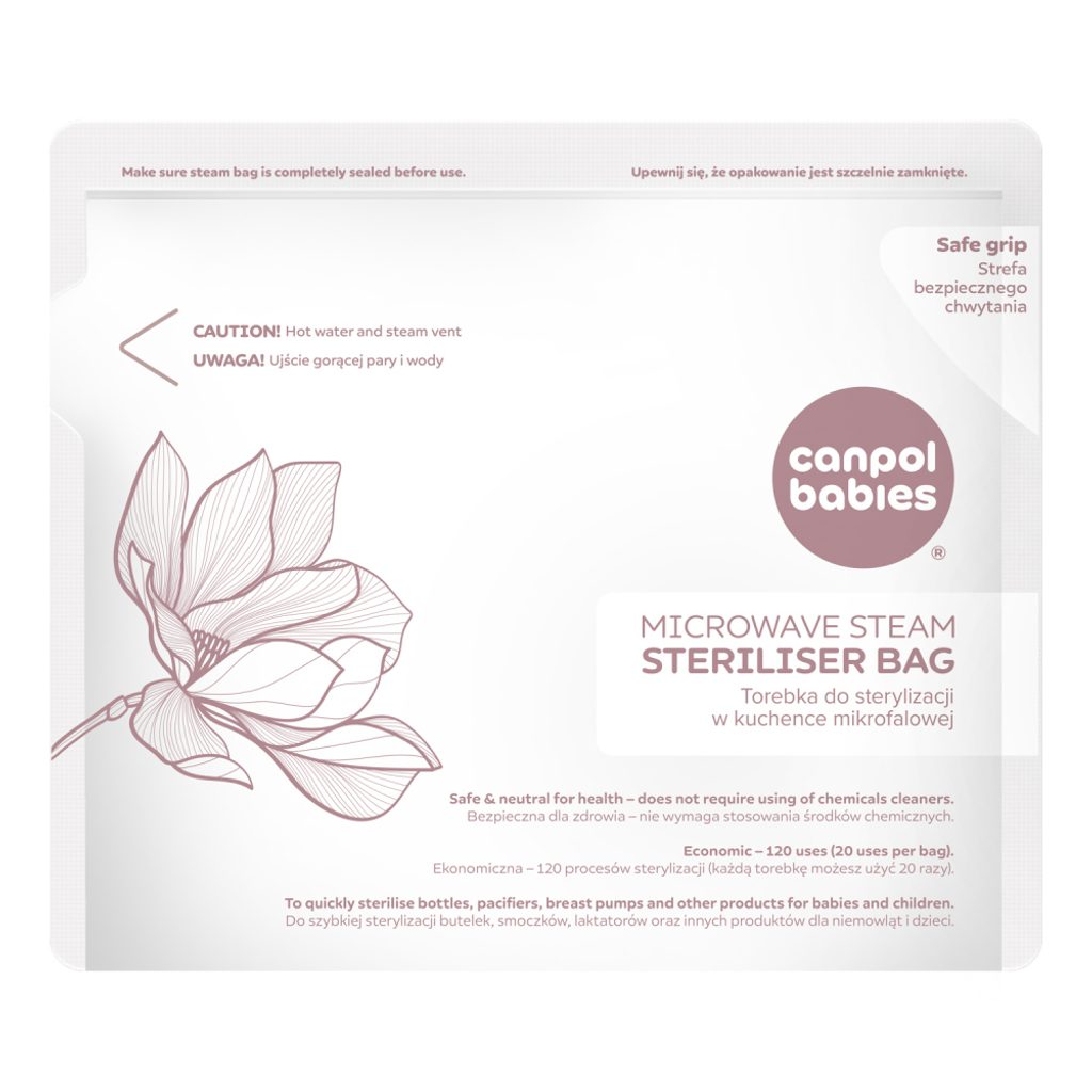 Sterilizační sáčky do mikrovlnné trouby Canpol babies představují jednoduchý, rychlý a bezpečný způsob sterilizace lahví, dudlíků, částí odsávaček mléka a dalších kojeneckých a dětských produktů. Tato forma sterilizace je bezpečná, bez chemikálií a trvá pouhých 90 sekund. Vodní pára, která se v sáčku vytváří během procesu sterilizace, eliminuje bakterie a choroboplodné zárodky a zajišťuje hygienickou čistotu. Každý sáček lze použít až 20krát, což umožňuje celkem 120 sterilizací v jednom balení. Tento produkt nahrazuje tradiční sterilizátor, když jste mimo domov a nemůžete si přístroj vzít s sebou nebo máte doma nedostatek úložného prostoru. Jsou vyrobeny z nezávadného plastu, bez BPA a jiných škodlivých látek.