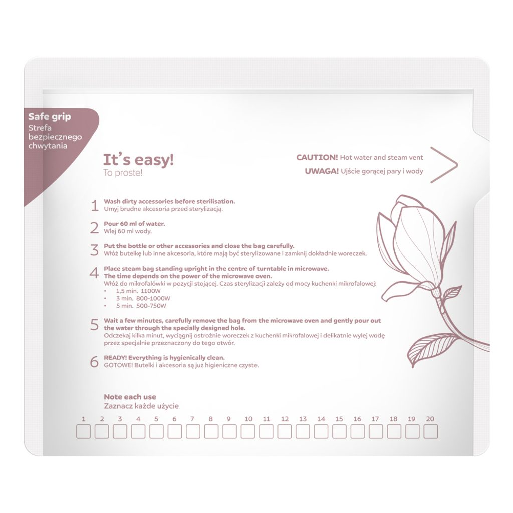 UPOZORNĚNÍ! Před použitím sáčku v mikrovlnné troubě se ujistěte, že je obal pevně uzavřen. Po sterilizaci sáček opatrně otevřete, může unikat horká pára. Zabráníte tak možnosti popálení.