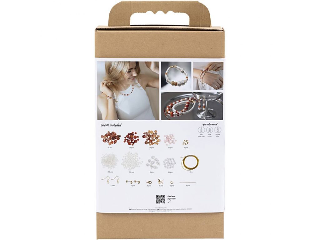 V sadě najdete vše potřebné pro výrobu náhrdelníku, náramku a páru náušnic: