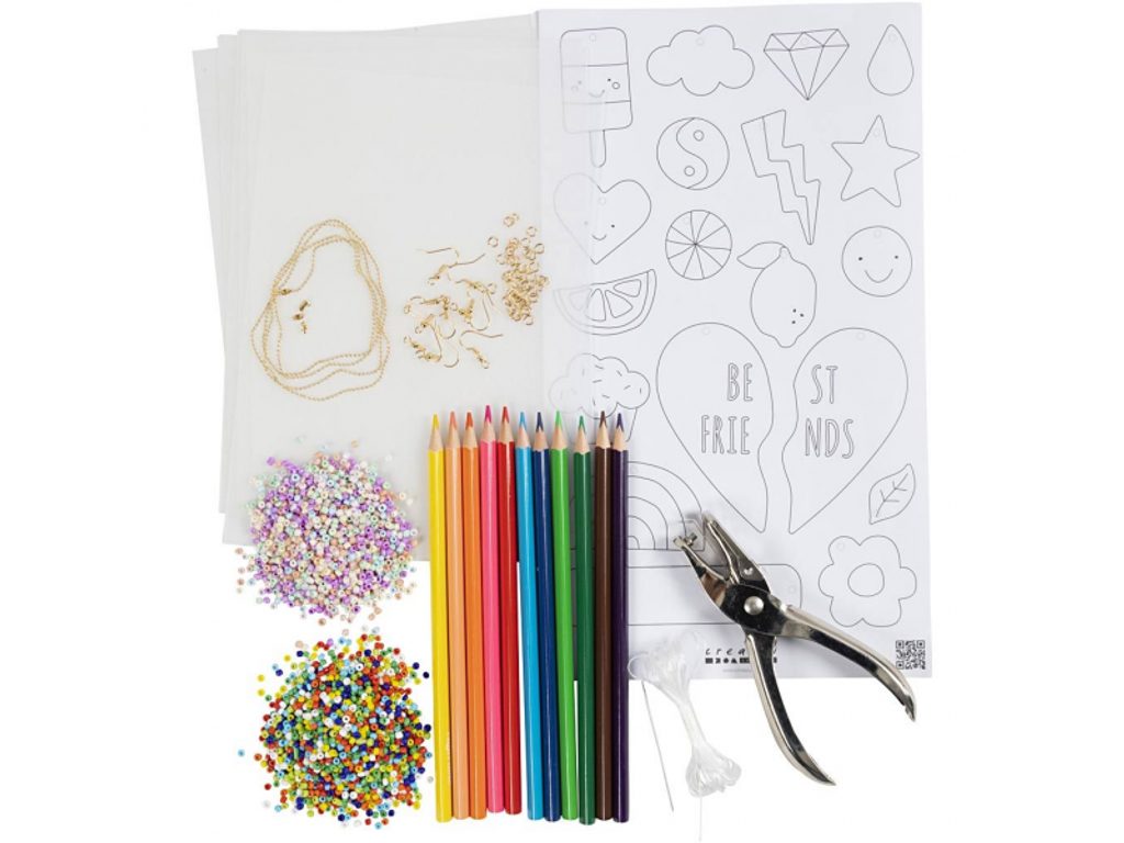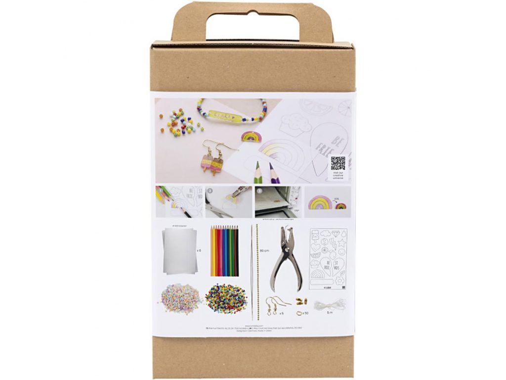 Celý postup je jednoduchý a krok za krokem: vybarvování, děrování kleštěmi, smršťování v troubě a finální sestavení s háčky, korálky a řetízky. Podrobný návod je přímo na krabičce i online přes QR kód – úspěch je zaručen i bez předchozích zkušeností.