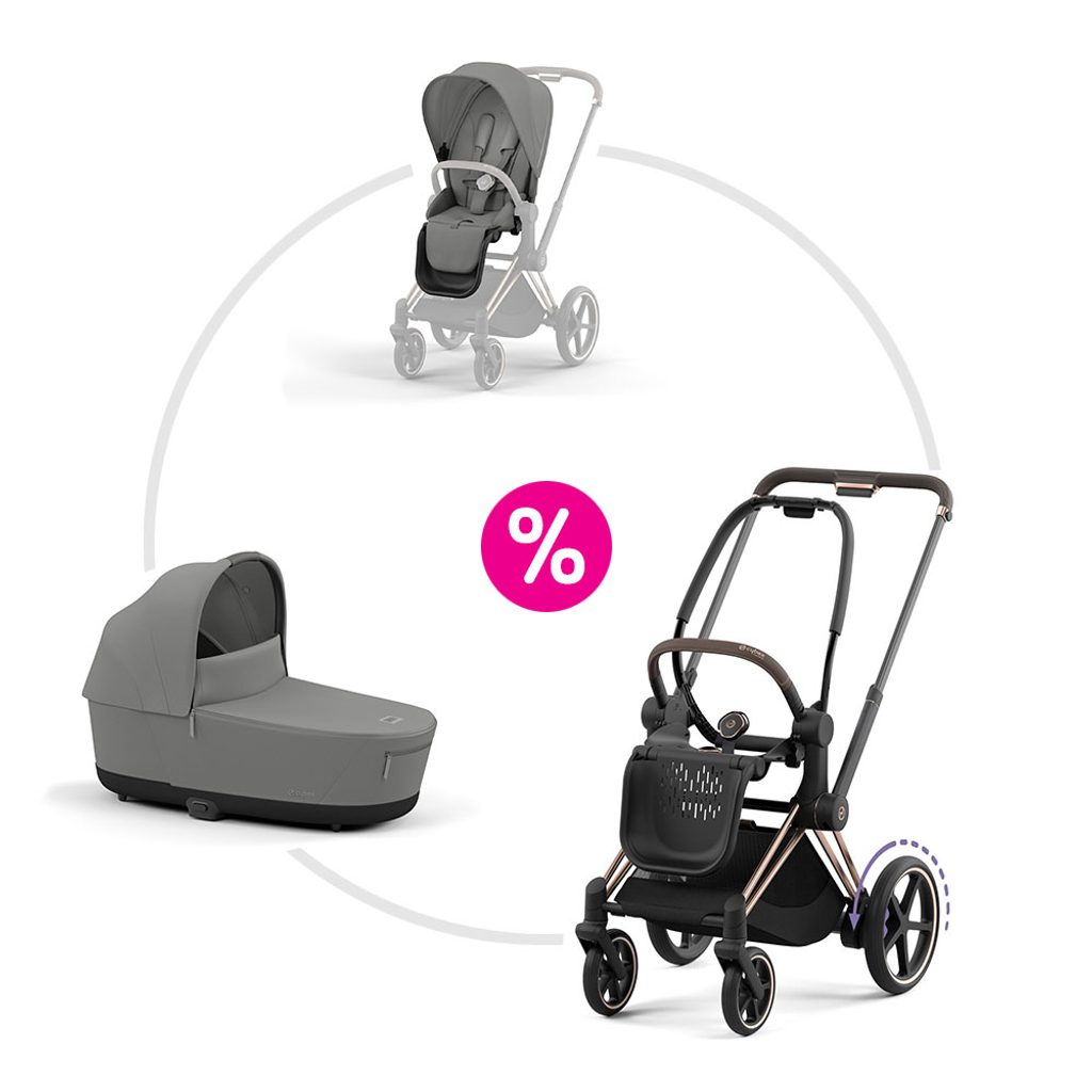 - Cestovní systém 4v1 – kompatibilní s autosedačkami CYBEX, korbičkou Priam Lux Carry Cot a sedáky pro golfovou konfiguraci