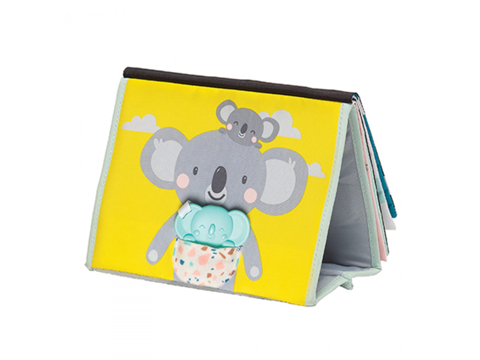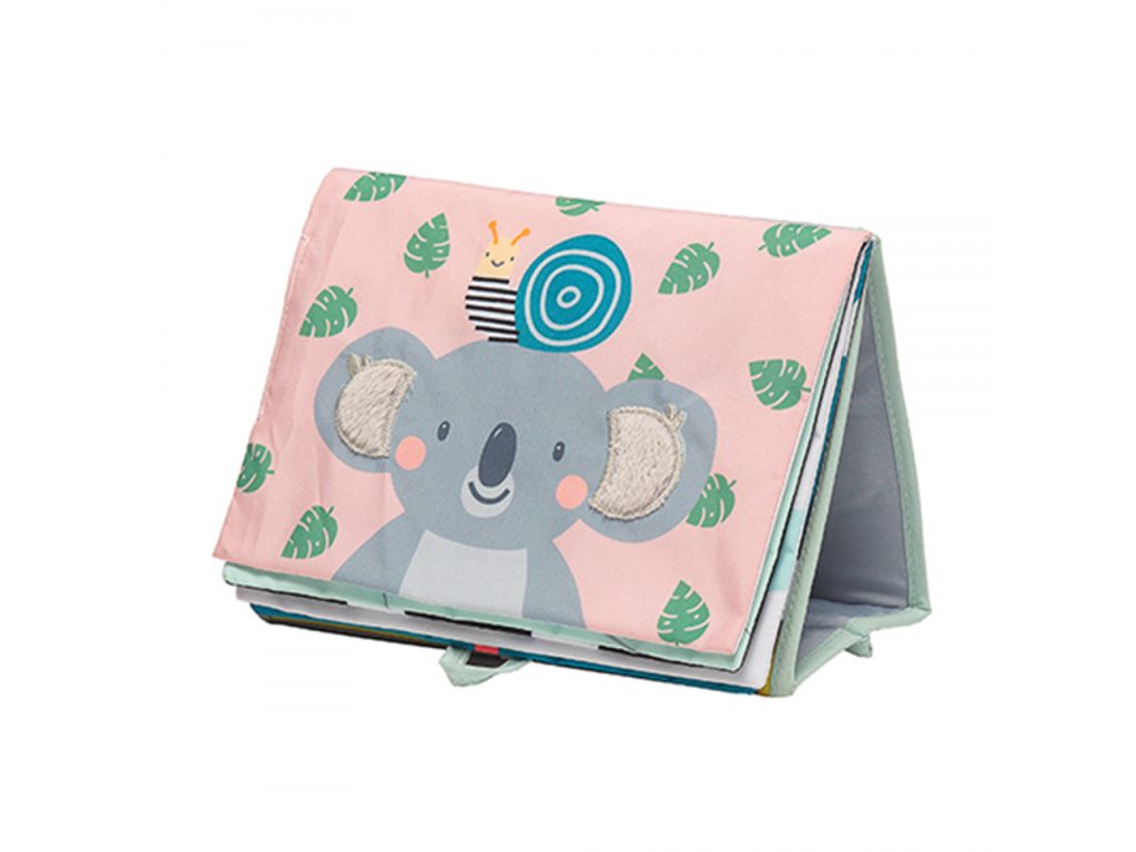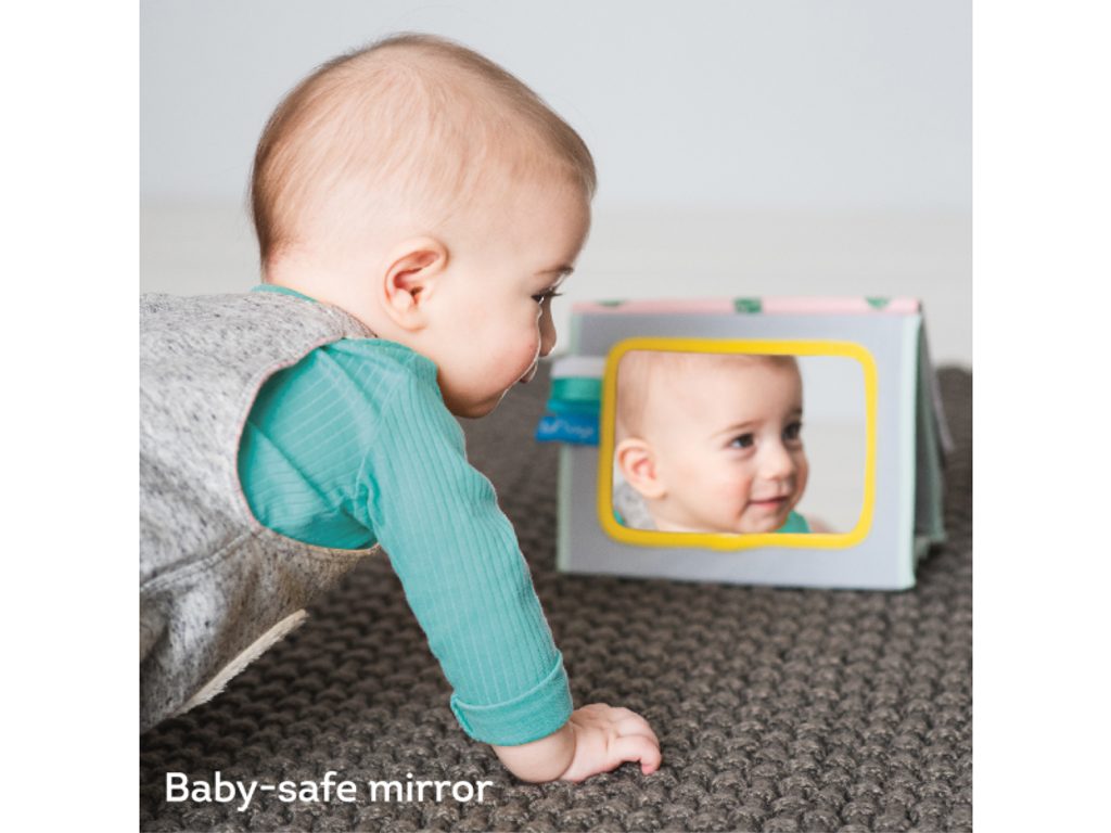 Textilní knížka s otáčecími šustícími stránkami ve tvaru stolního kalendáře nabízí množství neodolatelných obrázků s různorodými texturami, bezpečným zrcátkem, kousátkem apod. Ideální pro postavení před dítě při hře na bříšku. Knížka nabízí dva typy obrázků pro dvě vývojová stádia dítěte: 0-3 měsíce: stránky s bezpečným zrcátkem a vysoce kontrastními jednoduchými obrázky, které podněcují rozvoj smyslů a emoční inteligence dítěte. Od 3 měsíců: strana s barevnými obrázky a různorodými texturami ke zkoumání, které podporují rozvoj smyslů a jemné motoriky dítěte. Rozměry: 20,5 x 19,5 x 7,6 cm Vhodné pro děti od narození.