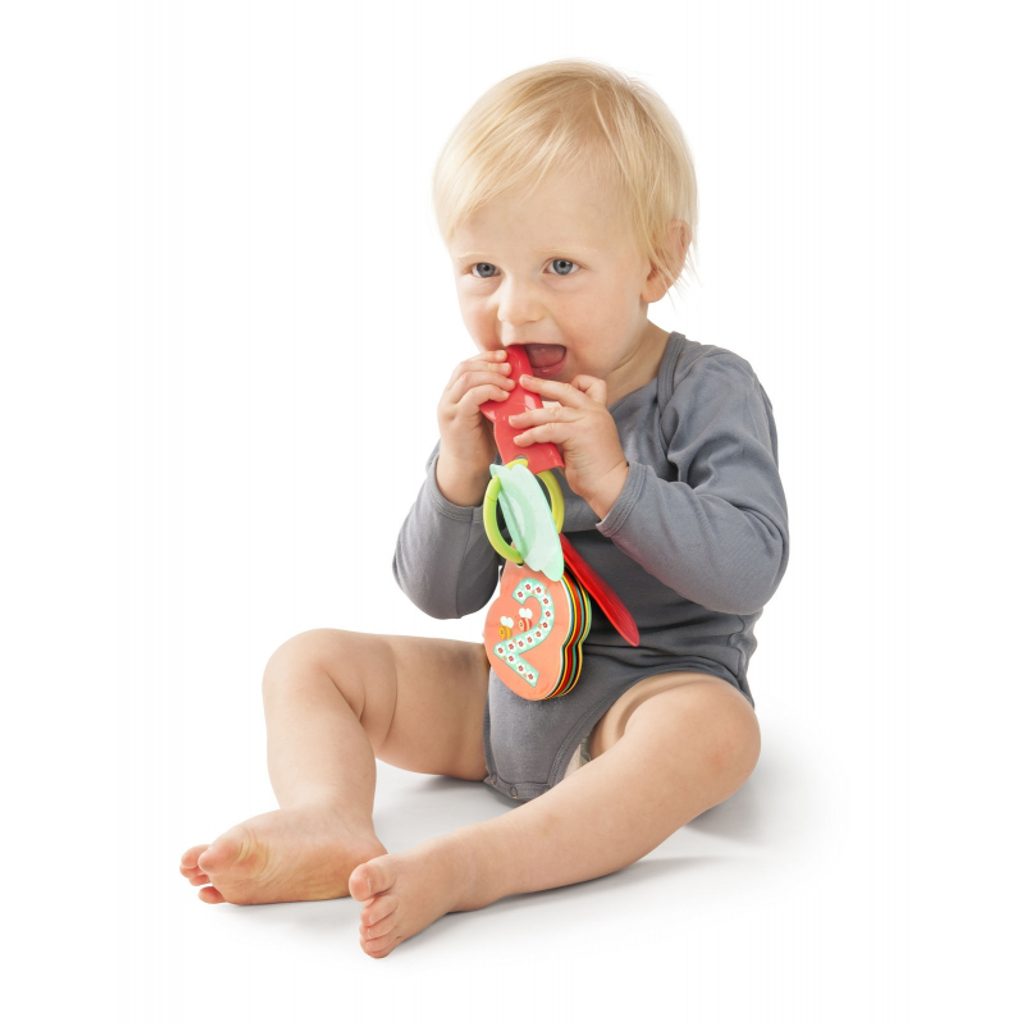 Otevíratelný kroužek umožňuje shromáždit kartičky a vytahovat jednu po druhé dle potřeby a skládat je na sebe. Kartičky obsahují tři měkké materiály a jsou vhodné ke žvýkání při prořezávání prvních zoubků.