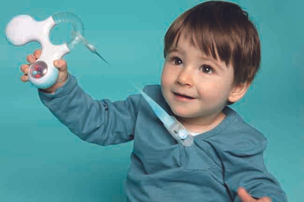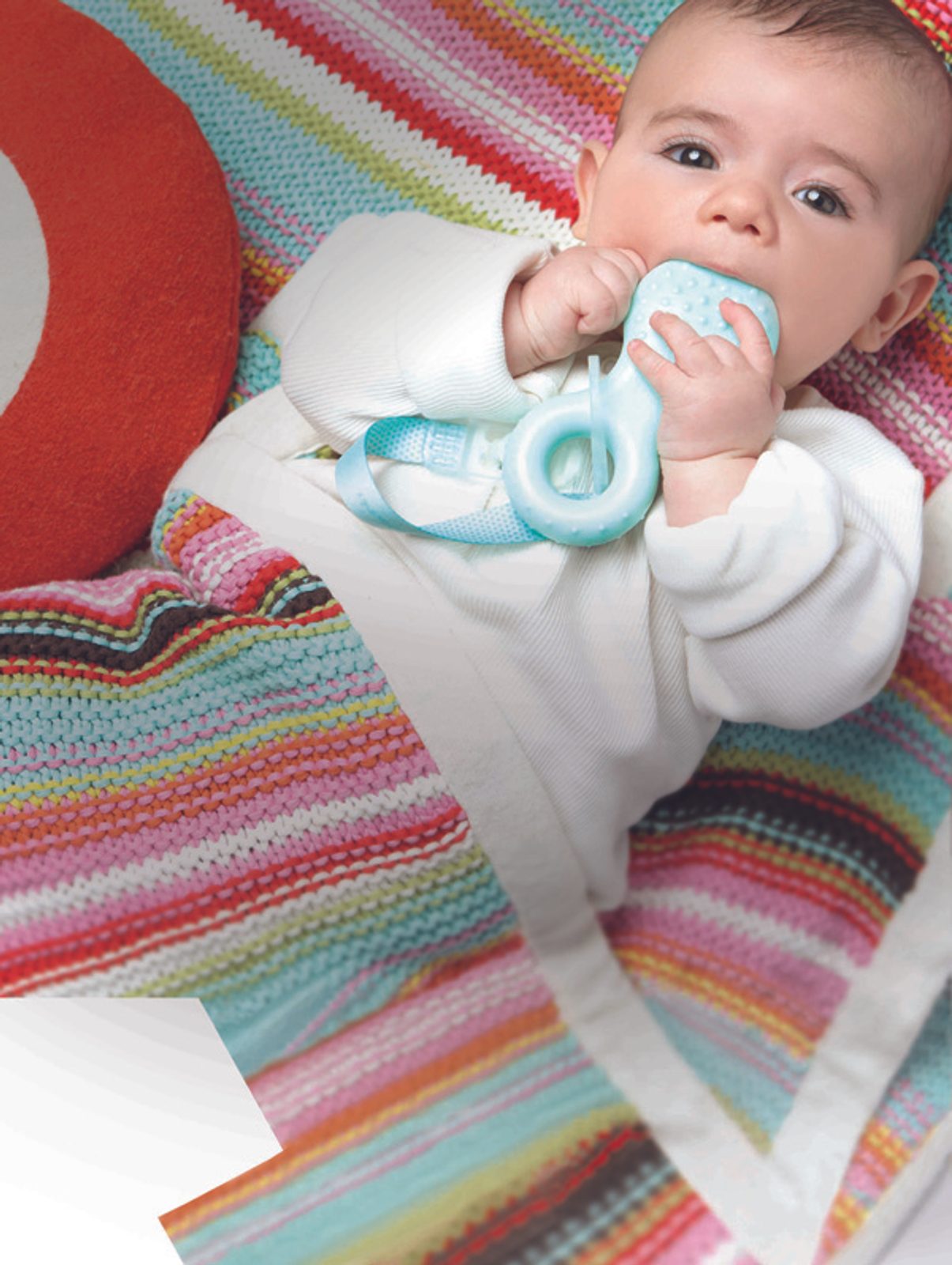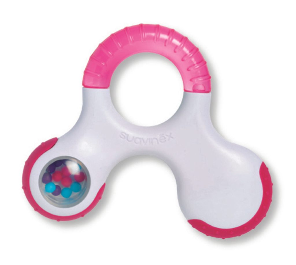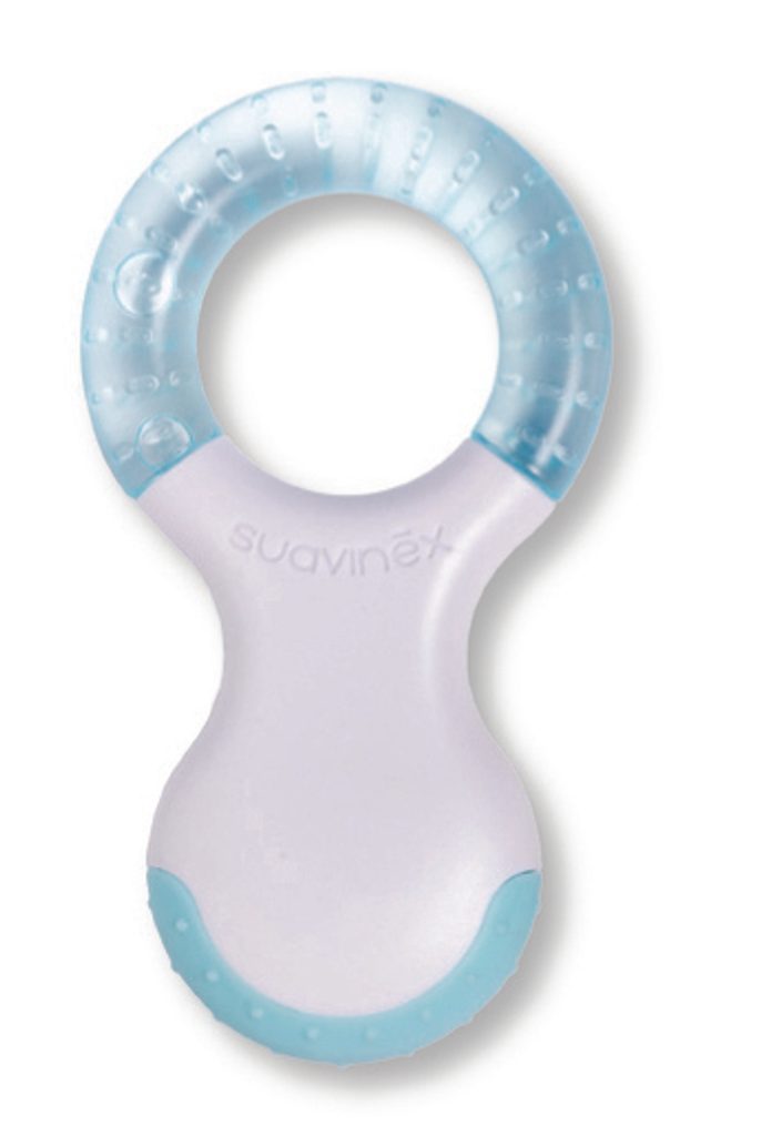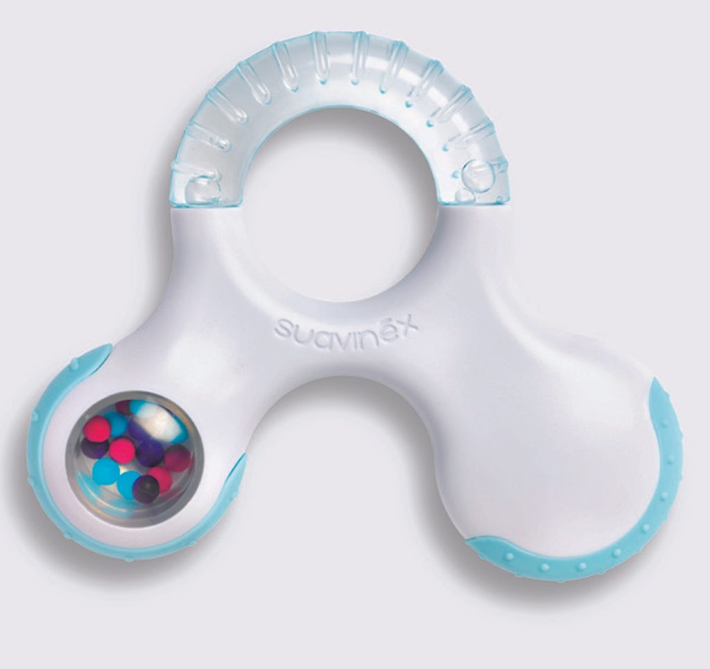 KROK 3 / STEP3: kousátko s několika strukturami a chladivou vodou pro úlevu při prořezávání třenových zoubků – stoliček, doplněno o chrastítko, které vzbudí zájem děťátka