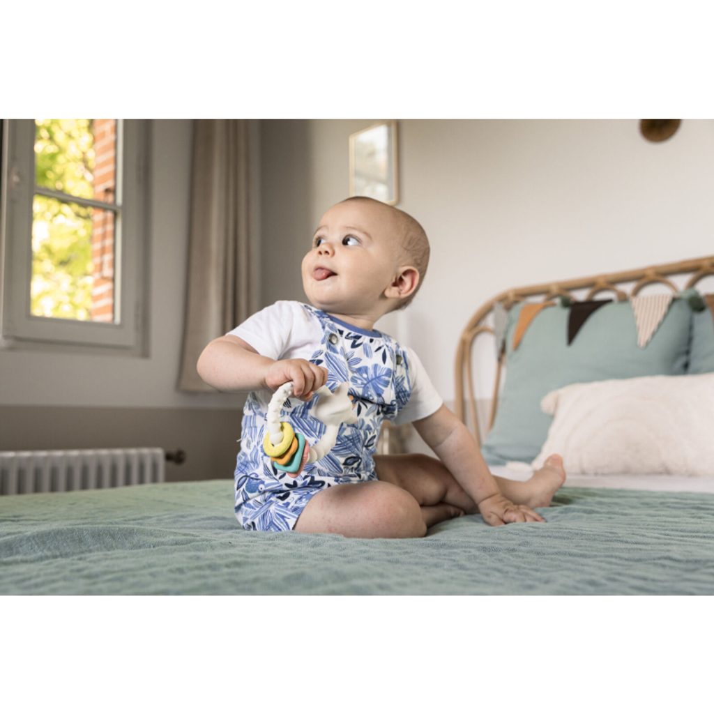 Bezpečný přírodní kousací kroužek je vyroben z 100% přírodního kaučuku získaného z kaučukovníku Hevea a z potravinářských barev. Hračka obsahuje mnoho měkkých částí určených ke kousání s různými tvary (uši, rohy nebo nos žirafky), které masírují dásně a poskytují dítěti úlevu od bolesti při prořezávání prvních zoubků. 4 barevné kroužky různých geometrických tvarů upoutají zrak a pozornost dítěte. Lehké a ergonomické, snadno se uchopují i malými dětskými ručičkami.
