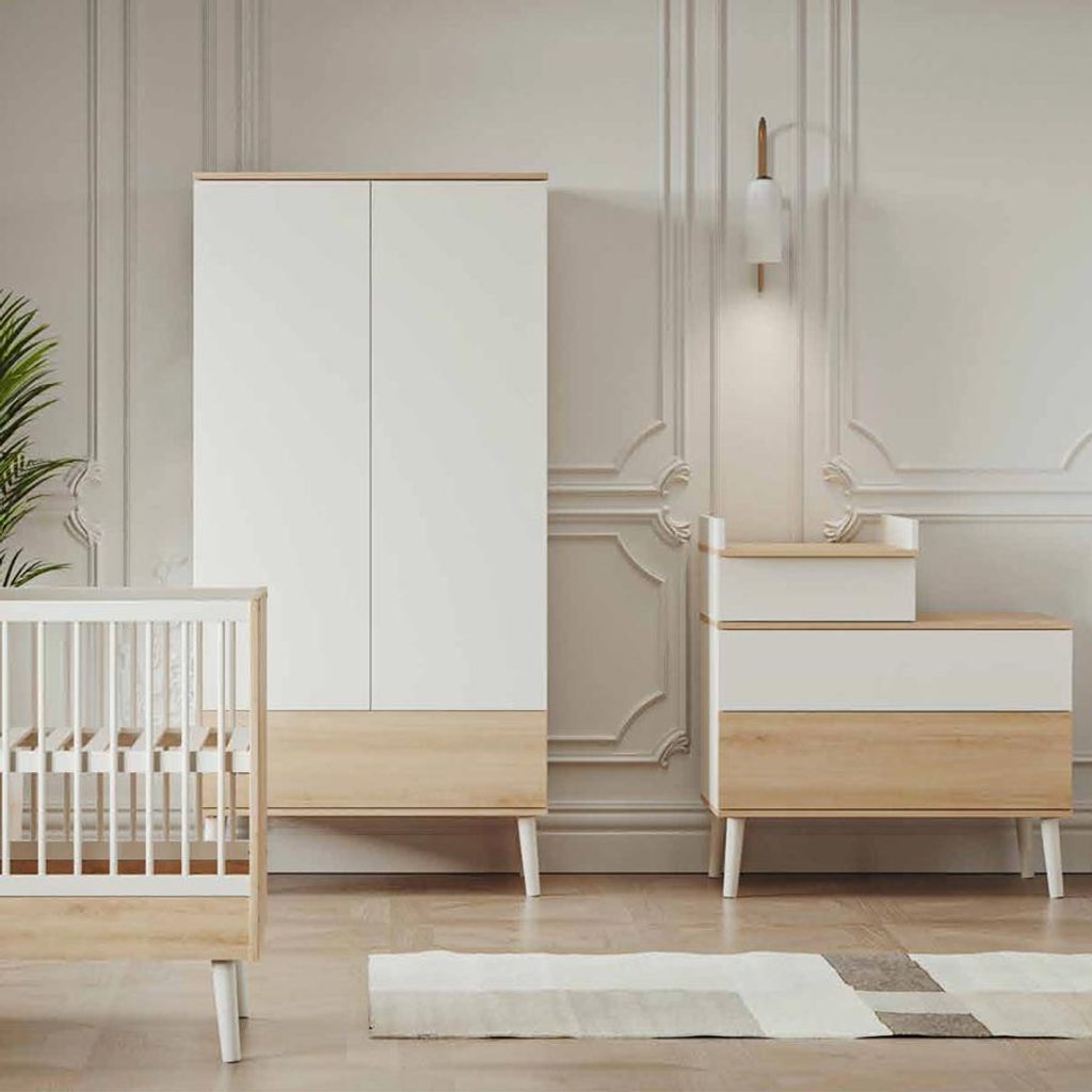 Komoda v kombinaci bílé a dekoru španělského dubu poskytne dostatek úložného prostoru pro přebalování a péči o dítě. Horní zásuvka je variabilní – může být umístěna vlevo, vpravo nebo uprostřed podle vašich potřeb.