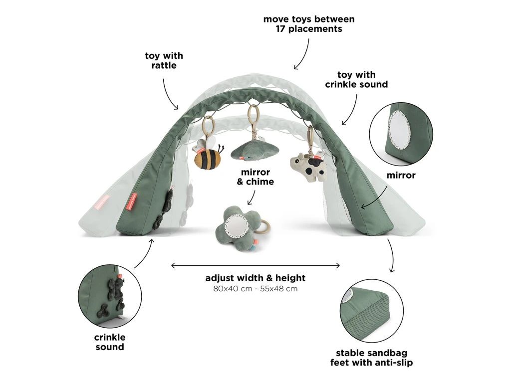 Volně stojící a snadno nastavitelný oblouk se závěsnými hračkami. Posiluje koordinaci a sílu. Senzorické hračky se zvuky a zrcátkem udrží pozornost dítěte.
