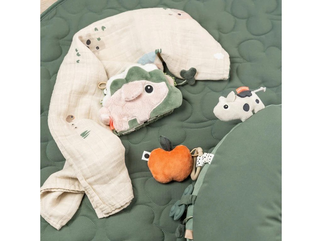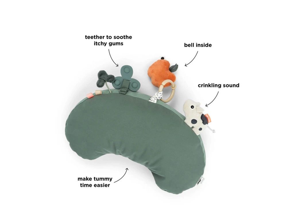Součástí polštářku je hračka s aktivitami, která nabízí celou řadu smyslových funkcí, jež motivují vaše dítě, aby bylo aktivnější a strávilo více času v této zdravé pozici. Kousátko a kroužky pomohou uklidnit svědění dásní, zatímco roztomilé kravička Dotti, štítky a chrastící plyšové jablíčko přinášejí zábavu a podněcují dětskou zvědavost.